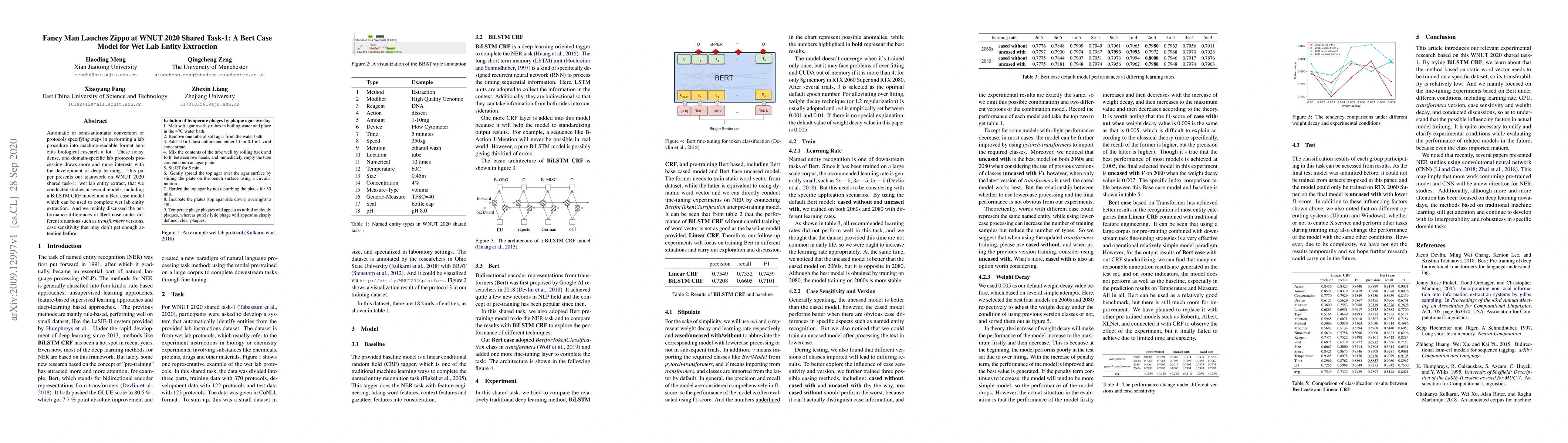 Automatic or semi-automatic conversion of protocols specifying steps in performing a lab procedure into machine-readable format benefits biological research a lot. These noisy, dense, and domain-specific lab protocols processing draws more and more interests with the development of deep learning. This paper presents our teamwork on WNUT 2020 shared task-1: wet lab entity extract, that we conducted studies in several models, including a BiLSTM CRF model and a Bert case model which can be used to complete wet lab entity extraction. And we mainly discussed the performance differences of \textbf{Bert case} under different situations such as \emph{transformers} versions, case sensitivity that may don't get enough attention before.