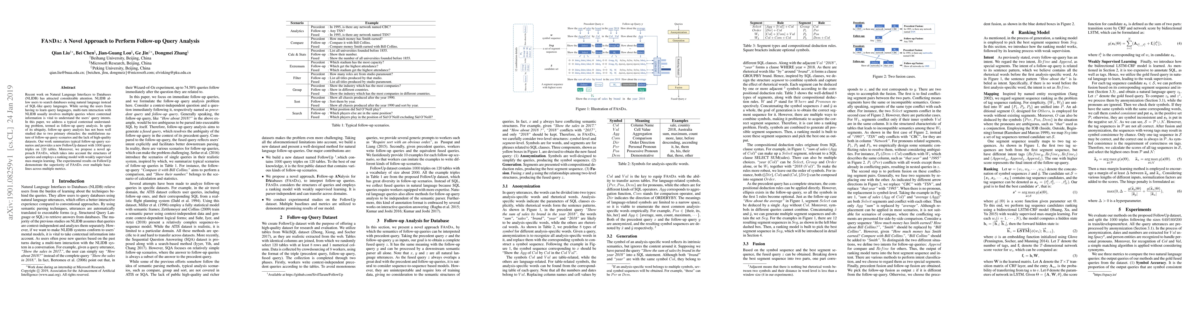 A new approach called FANDA is proposed to analyze follow-up queries in Natural Language Interfaces to Databases, improving contextual understanding with a ranking model and weakly supervised learning.