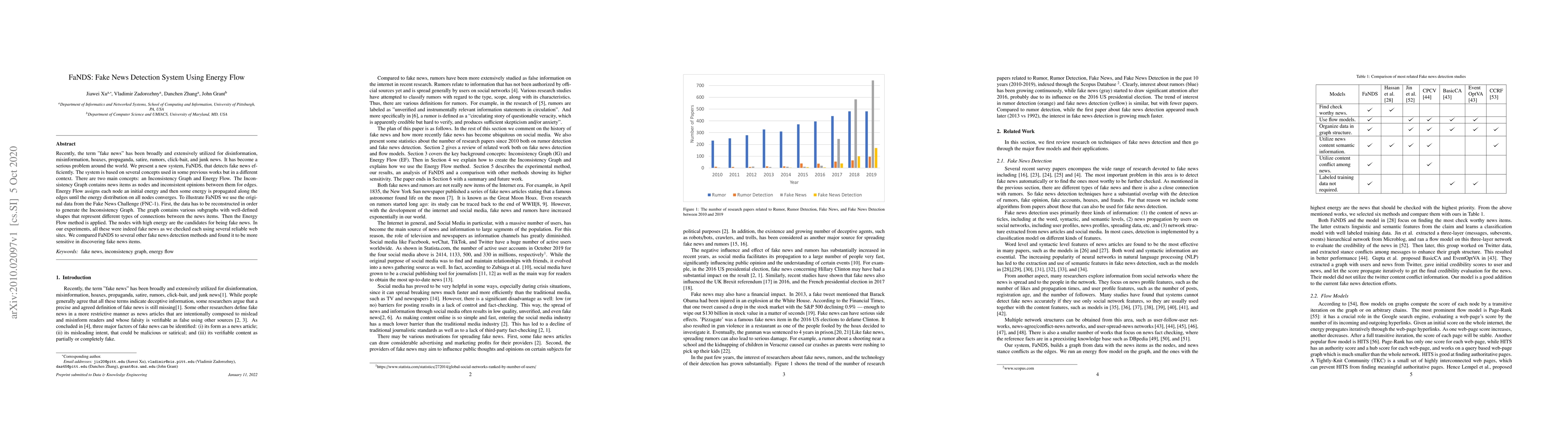 Recently, the term "fake news" has been broadly and extensively utilized for disinformation, misinformation, hoaxes, propaganda, satire, rumors, click-bait, and junk news. It has become a serious problem around the world. We present a new system, FaNDS, that detects fake news efficiently. The system is based on several concepts used in some previous works but in a different context. There are two main concepts: an Inconsistency Graph and Energy Flow. The Inconsistency Graph contains news items as nodes and inconsistent opinions between them for edges. Energy Flow assigns each node an initial energy and then some energy is propagated along the edges until the energy distribution on all nodes converges. To illustrate FaNDS we use the original data from the Fake News Challenge (FNC-1). First, the data has to be reconstructed in order to generate the Inconsistency Graph. The graph contains various subgraphs with well-defined shapes that represent different types of connections between the news items. Then the Energy Flow method is applied. The nodes with high energy are the candidates for being fake news. In our experiments, all these were indeed fake news as we checked each using several reliable web sites. We compared FaNDS to several other fake news detection methods and found it to be more sensitive in discovering fake news items.