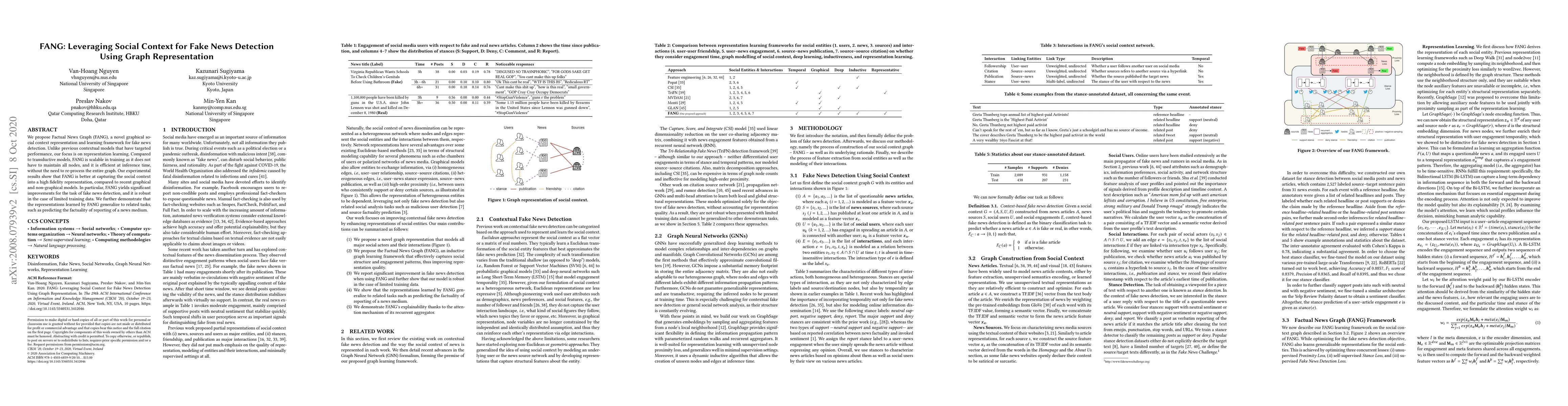 FANG is a novel graphical framework for fake news detection that leverages social context through representation learning. It demonstrates scalability and efficiency, significantly improving fake news detection and generalizing to related tasks like news medium factuality prediction.