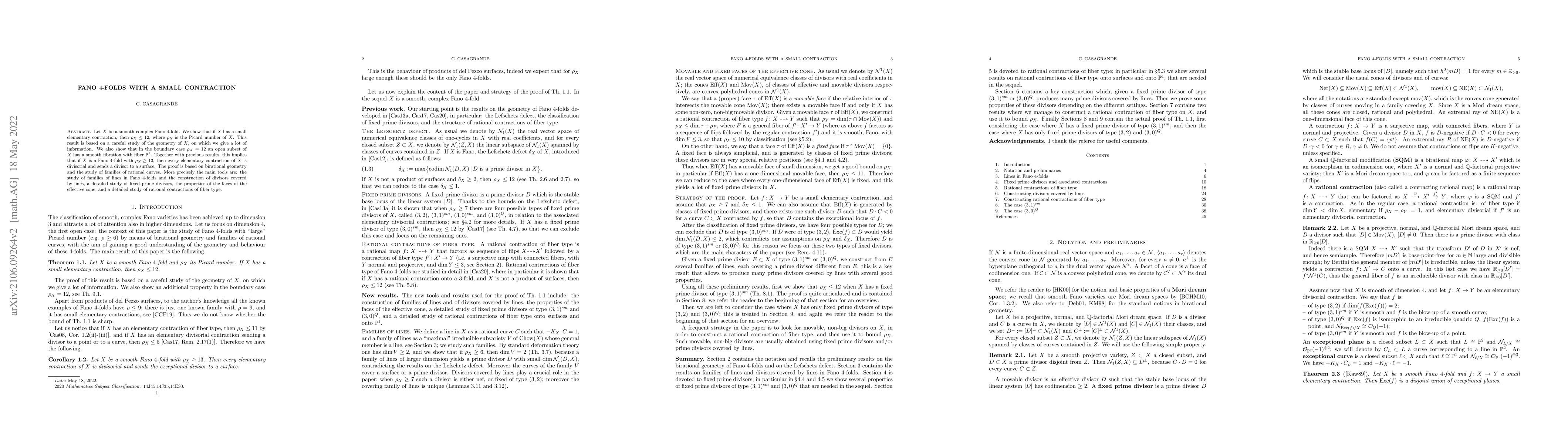 A Fano 4-fold with a small elementary contraction has a Picard number of at most 12, implying that non-contractible divisors are divisorial. The proof relies on birational geometry and the study of families of rational curves.