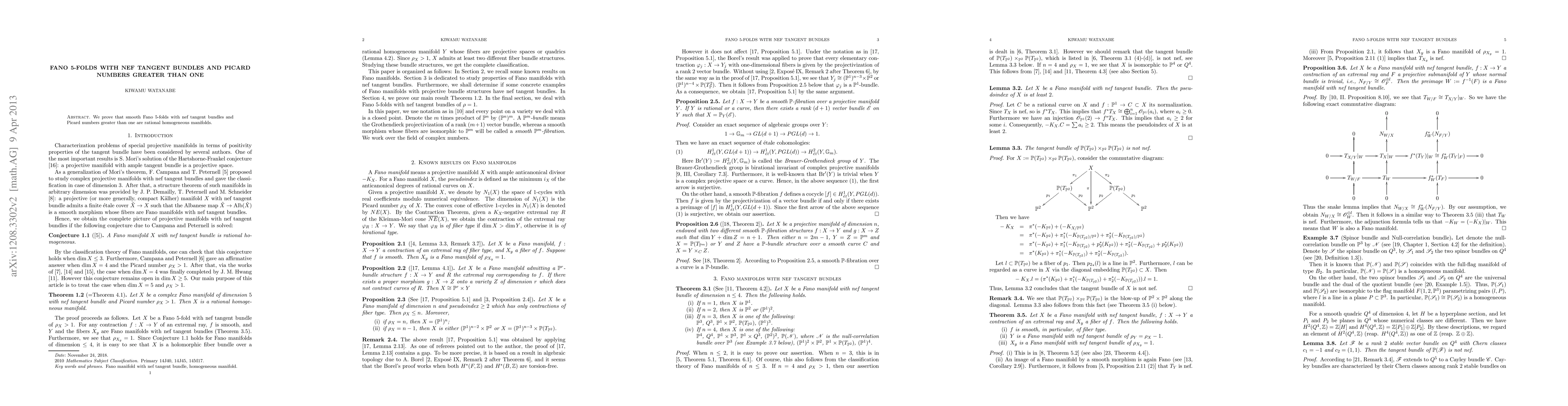 Summary: The paper proves that smooth Fano 5-folds with nef tangent bundles and Picard numbers exceeding one are rational homogeneous manifolds. This result extends the understanding of Fano varieties in higher dimensions.