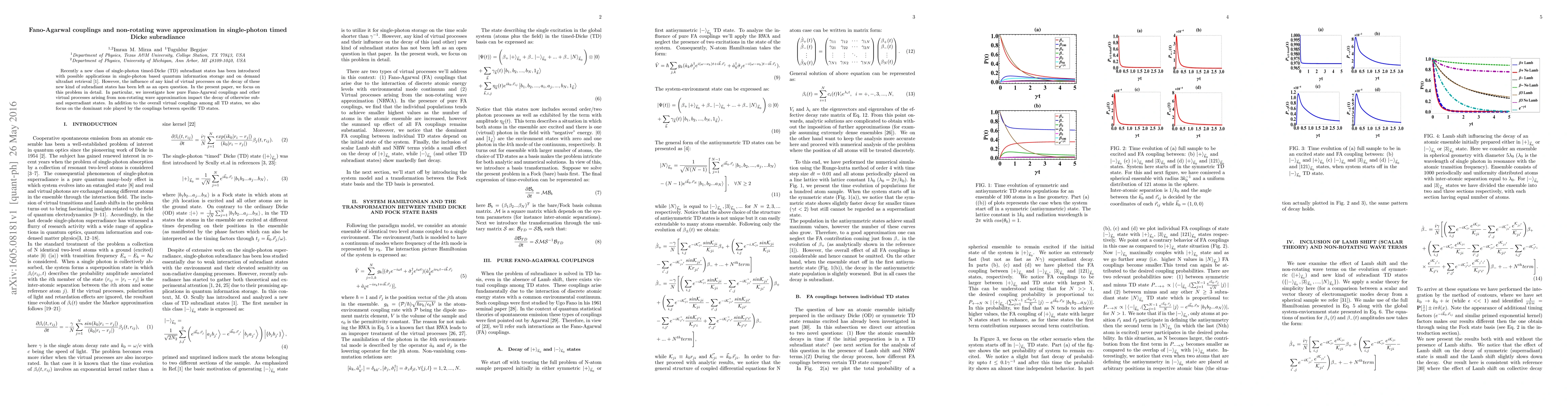 This paper examines the impact of Fano-Agarwal couplings and non-rotating wave approximation on single-photon timed-Dicke subradiant states' decay. It highlights the role of virtual processes in affecting subradiant and superradiant states, focusing on specific TD state couplings.