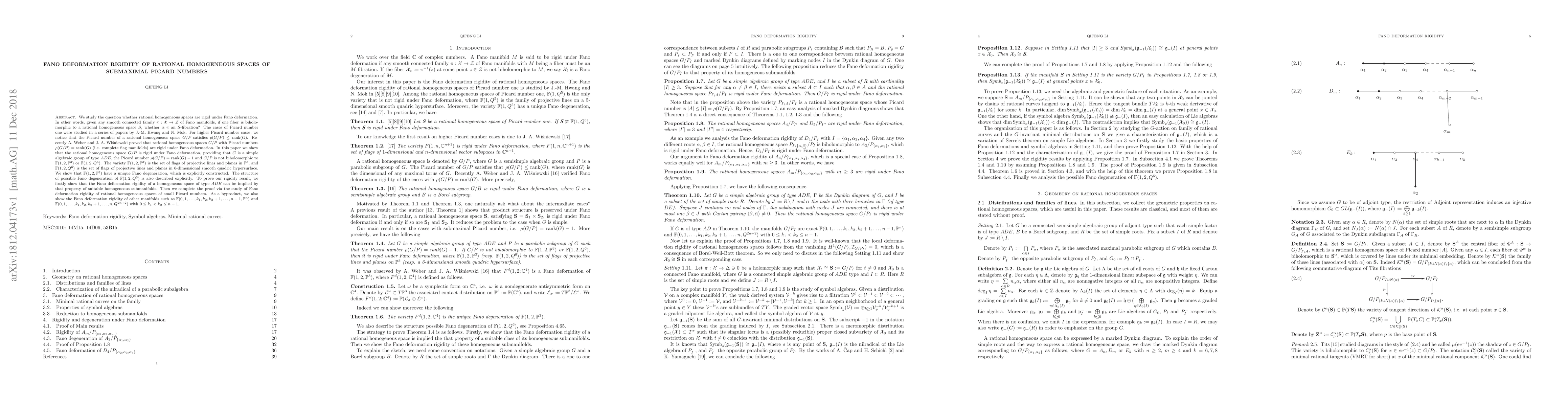 We study the question whether rational homogeneous spaces are rigid under Fano deformation. In other words, given any smooth connected family f:X -> Zof Fano manifolds, if one fiber is biholomorphic to a rational homogeneous space S, whether is f an S-fibration? The cases of Picard number one were studied in a series of papers by J.-M. Hwang and N. Mok. For higher Picard number cases, we notice that the Picard number of a rational homogeneous space G/P is less or equal to the rank of G. Recently A. Weber and J. A. Wisniewski proved that rational homogeneous spaces G/P with Picard numbers equal to the rank of G (i.e. complete flag manifolds) are rigid under Fano deformation. In this paper we show that the rational homogeneous space G/P is rigid under Fano deformation, providing that G is a simple algebraic group of type ADE, the Picard number equal to rank(G)-1 and G/P is not biholomorphic to F(1, 2, P^3) or F(1, 2, Q^6). The variety F(1, 2, P^3) is the set of flags of projective lines and planes in P^3, and F(1, 2, Q^6) is the set of flags of projective lines and planes in 6-dimensional smooth quadric hypersurface. We show that F(1, 2, P^3) have a unique Fano degeneration, which is explicitly constructed. The structure of possible Fano degeneration of F(1, 2, Q^6) is also described explicitly. To prove our rigidity result, we firstly show that the Fano deformation rigidity of a homogeneous space of type ADE can be implied by that property of suitable homogeneous submanifolds. Then we complete the proof via the study of Fano deformation rigidity of rational homogeneous spaces of small Picard numbers. As a byproduct, we also show the Fano deformation rigidity of other manifolds such as F(0, 1, ..., k_1, k_2, k_2+1, ..., n-1, P^n) and F(0, 1, ..., k_1, k_2, k_2+1, ..., n, Q^{2n+2}) with 0 <= k_1 < k_2 <= n-1.
