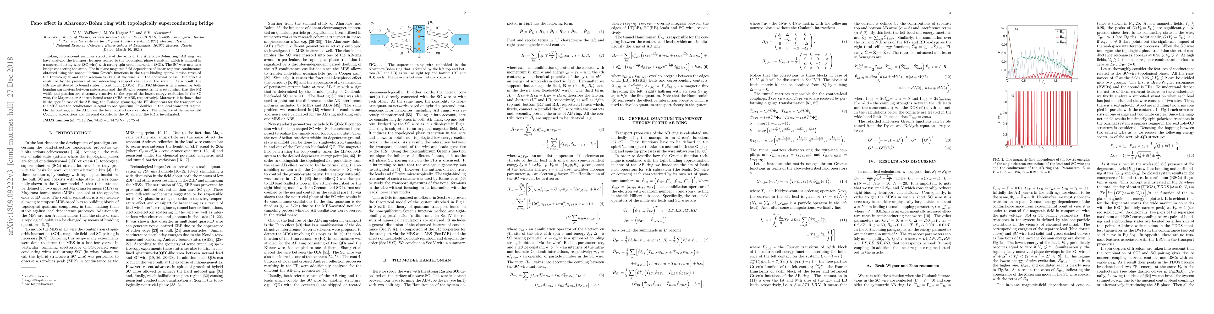Taking into account an inner structure of the arms of the Aharonov-Bohm ring (AB ring) we have analyzed the transport features related to the topological phase transition which is induced in a superconducting wire (SC wire) with strong spin-orbit interaction (SOI). The SC wire acts as a bridge connecting the arms. The in-plane magnetic-field dependence of linear-response conductance obtained using the nonequilibrium Green's functions in the tight-binding approximation revealed the Breit-Wigner and Fano resonances (FRs) if the wire is in the nontrivial phase. The effect is explained by the presence of two interacting transport channels in the system. As a result, the FRs are attributed to bound states in continuum (BSCs). The BSC lifetime is determined by both hopping parameters between subsystems and the SC-wire properties. It is established that the FR width and position are extremely sensitive to the type of the lowest-energy excitation in the SC wire, the Majorana or Andreev bound state (MBS or ABS, respectively). Moreover, it is shown that in the specific case of the AB ring, the T-shape geometry, the FR disappears for the transport via the MBS and the conductance is equal to one quantum. It doubles in the local transport regime. On the contrary, in the ABS case the local conductance vanishes. The influence of the mean-field Coulomb interactions and diagonal disorder in the SC wire on the FR is investigated.