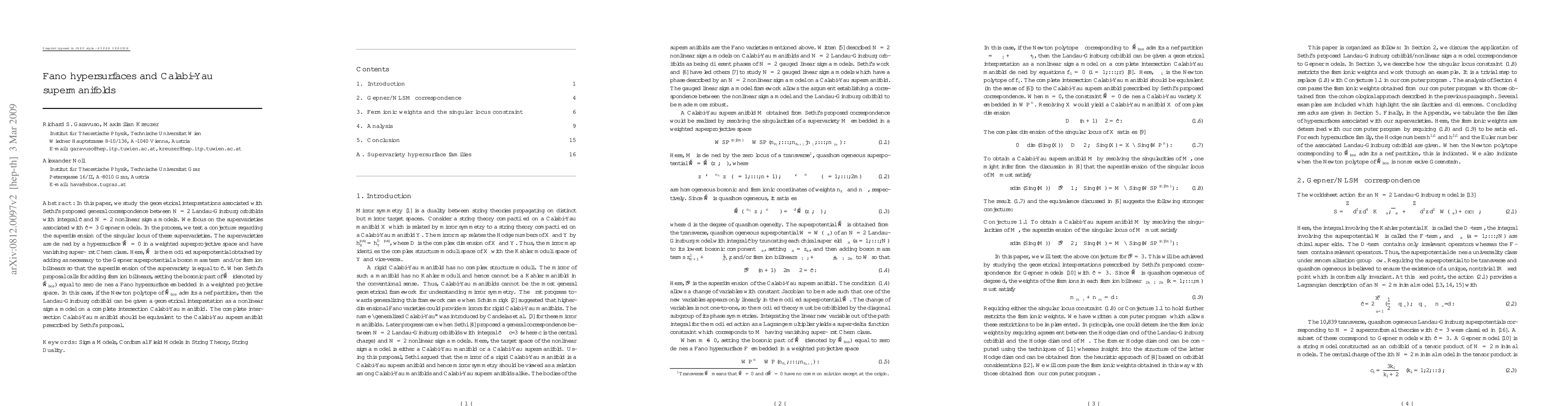 In this paper, we study the geometrical interpretations associated with Sethi's proposed general correspondence between N = 2 Landau-Ginzburg orbifolds with integral \hat{c} and N = 2 nonlinear sigma models. We focus on the supervarieties associated with \hat{c} = 3 Gepner models. In the process, we test a conjecture regarding the superdimension of the singular locus of these supervarieties. The supervarieties are defined by a hypersurface \widetilde{W} = 0 in a weighted superprojective space and have vanishing super-first Chern class. Here, \widetilde{W} is the modified superpotential obtained by adding as necessary to the Gepner superpotential a boson mass term and/or fermion bilinears so that the superdimension of the supervariety is equal to \hat{c}. When Sethi's proposal calls for adding fermion bilinears, setting the bosonic part of \widetilde{W} (denoted by \widetilde{W}_{bos}) equal to zero defines a Fano hypersurface embedded in a weighted projective space. In this case, if the Newton polytope of \widetilde{W}_{bos} admits a nef partition, then the Landau-Ginzburg orbifold can be given a geometrical interpretation as a nonlinear sigma model on a complete intersection Calabi-Yau manifold. The complete intersection Calabi-Yau manifold should be equivalent to the Calabi-Yau supermanifold prescribed by Sethi's proposal.