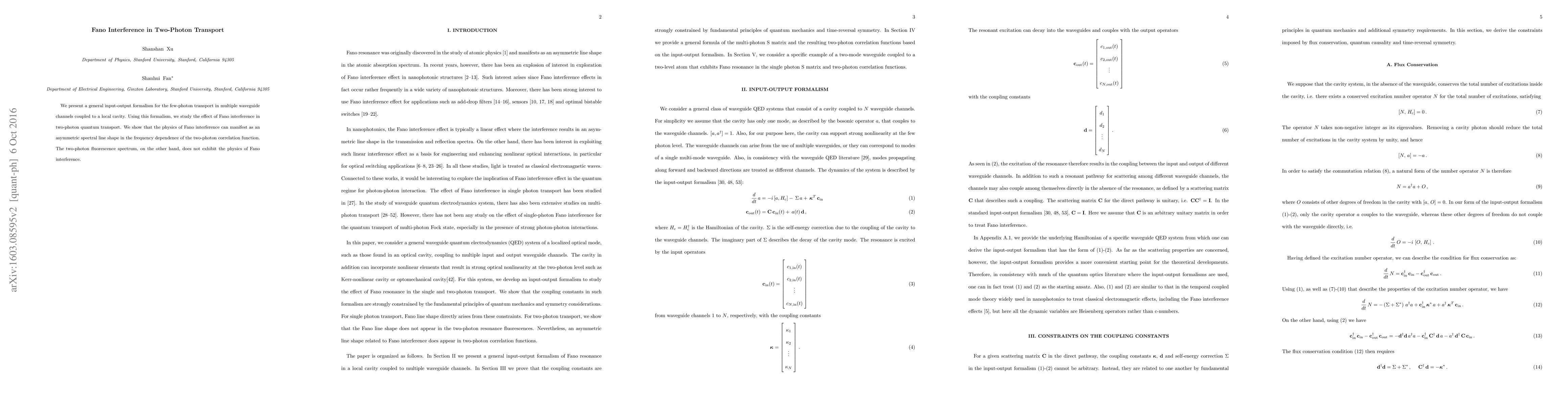 We present a general input-output formalism for the few-photon transport in multiple waveguide channels coupled to a local cavity. Using this formalism, we study the effect of Fano interference in two-photon quantum transport. We show that the physics of Fano interference can manifest as an asymmetric spectral line shape in the frequency dependence of the two-photon correlation function. The two-photon fluorescence spectrum, on the other hand, does not exhibit the physics of Fano interference.