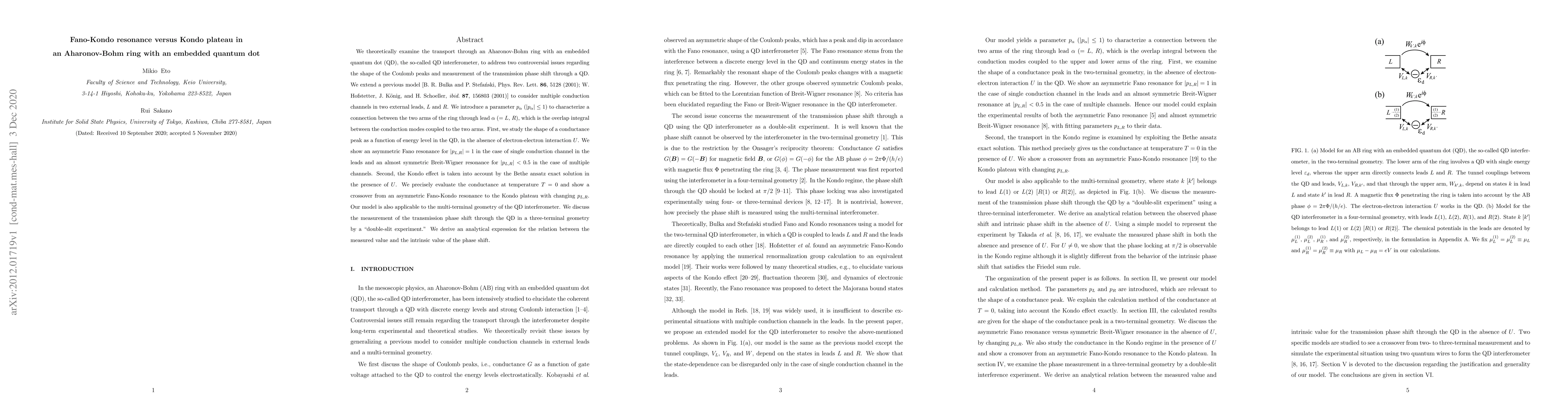 We theoretically examine the transport through an Aharonov-Bohm ring with an embedded quantum dot (QD), the so-called QD interferometer, to address two controversial issues regarding the shape of the Coulomb peaks and measurement of the transmission phase shift through a QD. We extend a previous model [B. R. Bulka and P. Stefanski, Phys. Rev. Lett. 86, 5128 (2001); W. Hofstetter, J. Konig, and H. Schoeller, ibid. 87, 156803 (2001)] to consider multiple conduction channels in two external leads, L and R. We introduce a parameter p_{\alpha} (|p_{\alpha}| \le 1) to characterize a connection between the two arms of the ring through lead \alpha (=L, R), which is the overlap integral between the conduction modes coupled to the two arms. First, we study the shape of a conductance peak as a function of energy level in the QD, in the absence of electron-electron interaction U. We show an asymmetric Fano resonance for |p_{L,R}| = 1 in the case of single conduction channel in the leads and an almost symmetric Breit-Wigner resonance for |p_{L,R}| < 0.5 in the case of multiple channels. Second, the Kondo effect is taken into account by the Bethe ansatz exact solution in the presence of U. We precisely evaluate the conductance at temperature T=0 and show a crossover from an asymmetric Fano-Kondo resonance to the Kondo plateau with changing p_{L,R}. Our model is also applicable to the multi-terminal geometry of the QD interferometer. We discuss the measurement of the transmission phase shift through the QD in a three-terminal geometry by a "double-slit experiment." We derive an analytical expression for the relation between the measured value and the intrinsic value of the phase shift.