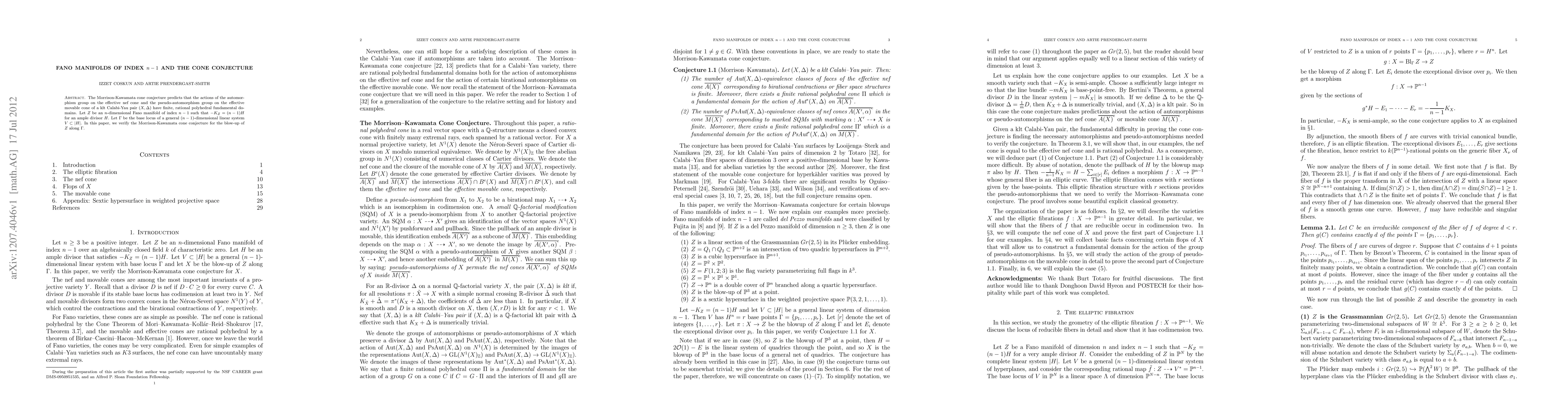 The Morrison-Kawamata cone conjecture predicts that the actions of the automorphism group on the effective nef cone and the pseudo-automorphism group on the effective movable cone of a klt Calabi-Yau pair $(X, \Delta)$ have finite, rational polyhedral fundamental domains. Let $Z$ be an $n$-dimensional Fano manifold of index $n-1$ such that $-K_Z = (n-1) H$ for an ample divisor $H$. Let $\Gamma$ be the base locus of a general $(n-1)$-dimensional linear system $V \subset |H|$. In this paper, we verify the Morrison-Kawamata cone conjecture for the blow-up of $Z$ along $\Gamma$.