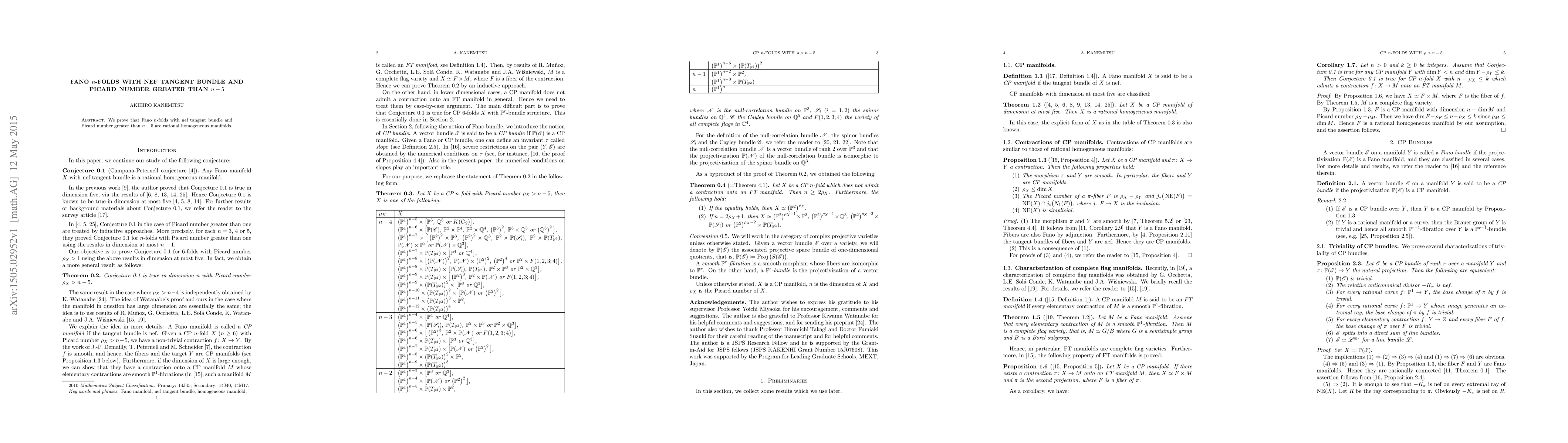 Summary: The paper proves that Fano n-folds possessing a nef tangent bundle and a Picard number exceeding n-5 are rational homogeneous manifolds. This finding provides a significant classification result in the study of algebraic geometry.