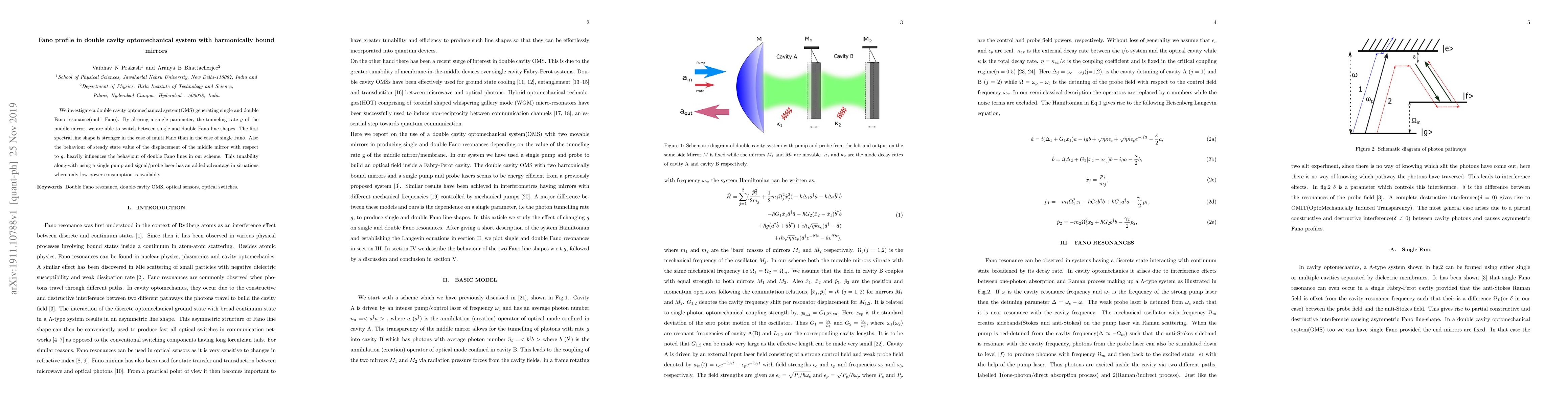 This paper explores a double cavity optomechanical system that can generate single or double Fano resonances by tuning the tunneling rate of the middle mirror. The study finds that the multi-Fano resonance exhibits stronger spectral line shapes and that the displacement of the middle mirror's steady state value significantly affects the double Fano lines, offering a low-power tunable solution.