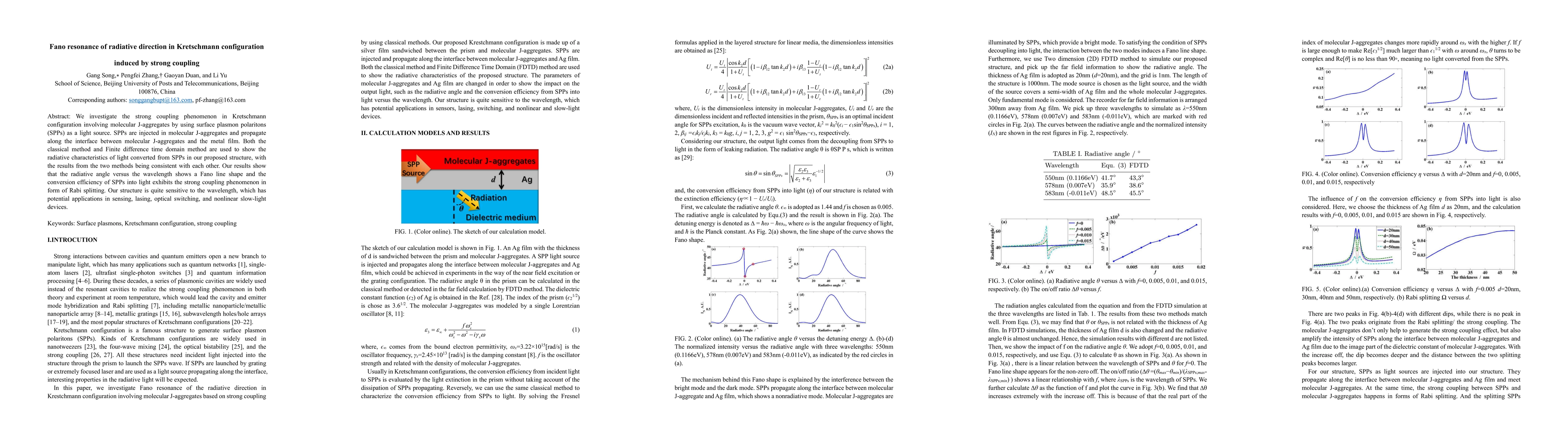 We investigate the strong coupling phenomenon in Kretschmann configuration involving molecular J-aggregates by using surface plasmon polaritons (SPPs) as a light source. SPPs are injected in molecular J-aggregates and propagate along the interface between molecular J-aggregates and the metal film. Both the classical method and Finite difference time domain method are used to show the radiative characteristics of light converted from SPPs in our proposed structure, with the results from the two methods being consistent with each other. Our results show that the radiative angle versus the wavelength shows a Fano line shape and the conversion efficiency of SPPs into light exhibits the strong coupling phenomenon in form of Rabi splitting. Our structure is quite sensitive to the wavelength, which has potential applications in sensing, lasing, optical switching, and nonlinear slow-light devices.