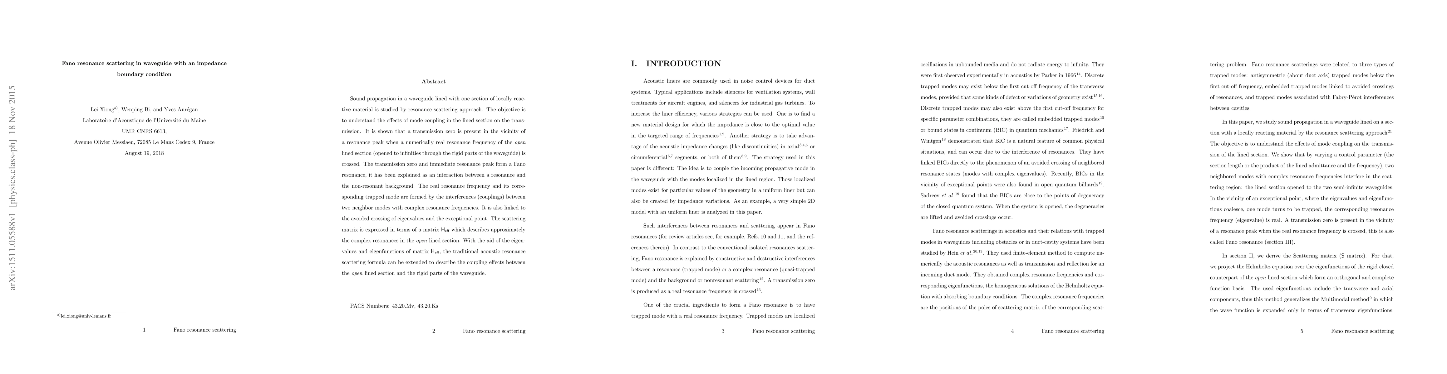 Sound propagation in a waveguide lined with one section of locally reactive material is studied by resonance scattering approach. The objective is to understand the effects of mode coupling in the lined section on the transmission. It is shown that a transmission zero is present in the vicinity of a resonance peak when a numerically real resonance frequency of the open lined section (opened to infinities through the rigid parts of the waveguide) is crossed. The transmission zero and immediate resonance peak form a Fano resonance, it has been explained as an interaction between a resonance and the non-resonant background. The real resonance frequency and its corresponding trapped mode are formed by the interferences (couplings) between two neighbor modes with complex resonance frequencies. It is also linked to the avoided crossing of eigenvalues and the exceptional point. The scattering matrix is expressed in terms of a matrix $\mathsf{H_{eff}}$ which describes approximately the complex resonances in the open lined section. With the aid of the eigenvalues and eigenfunctions of matrix $\mathsf{H_{eff}}$, the traditional acoustic resonance scattering formula can be extended to describe the coupling effects between the open lined section and the rigid parts of the waveguide.