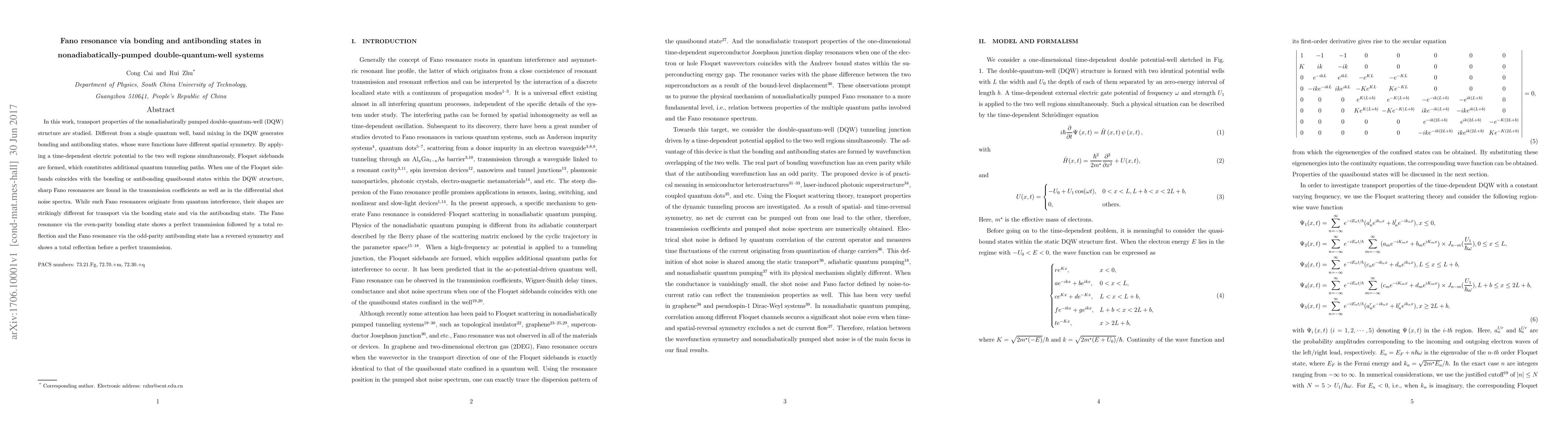 This paper investigates transport properties in nonadiabatically pumped double-quantum-well systems, revealing Fano resonances due to quantum interference from bonding and antibonding states. The Fano resonance shapes differ significantly between the even-parity bonding and odd-parity antibonding states, showcasing distinct transmission behaviors.