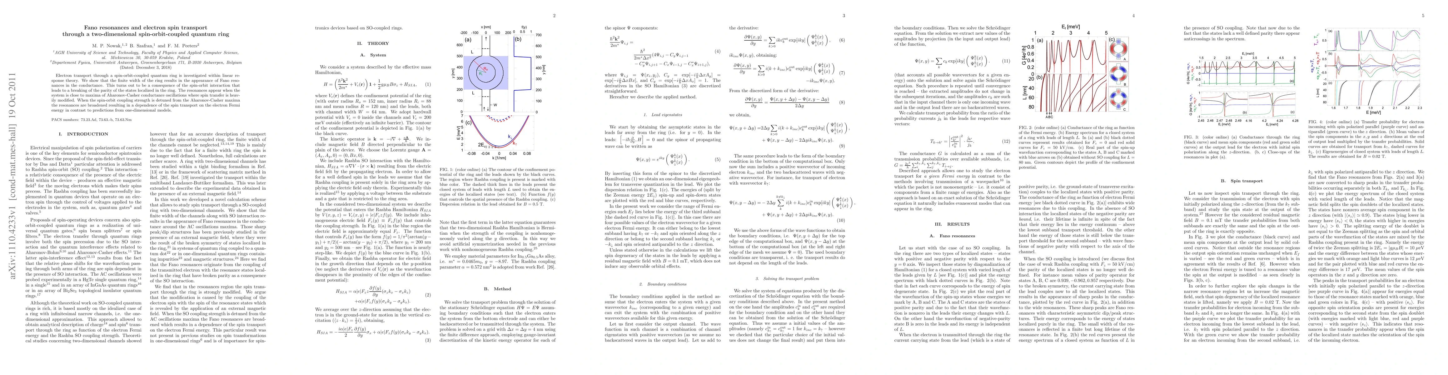Electron transport through a spin-orbit-coupled quantum ring is investigated within linear response theory. We show that the finite width of the ring results in the appearance of Fano resonances in the conductance. This turns out to be a consequence of the spin-orbit interaction that leads to a breaking of the parity of the states localized in the ring. The resonances appear when the system is close to maxima of Aharonov-Casher conductance oscillations where spin transfer is heavily modified. When the spin-orbit coupling strength is detuned from the Aharonov-Casher maxima the resonances are broadened resulting in a dependence of the spin transport on the electron Fermi energy in contrast to predictions from one-dimensional models