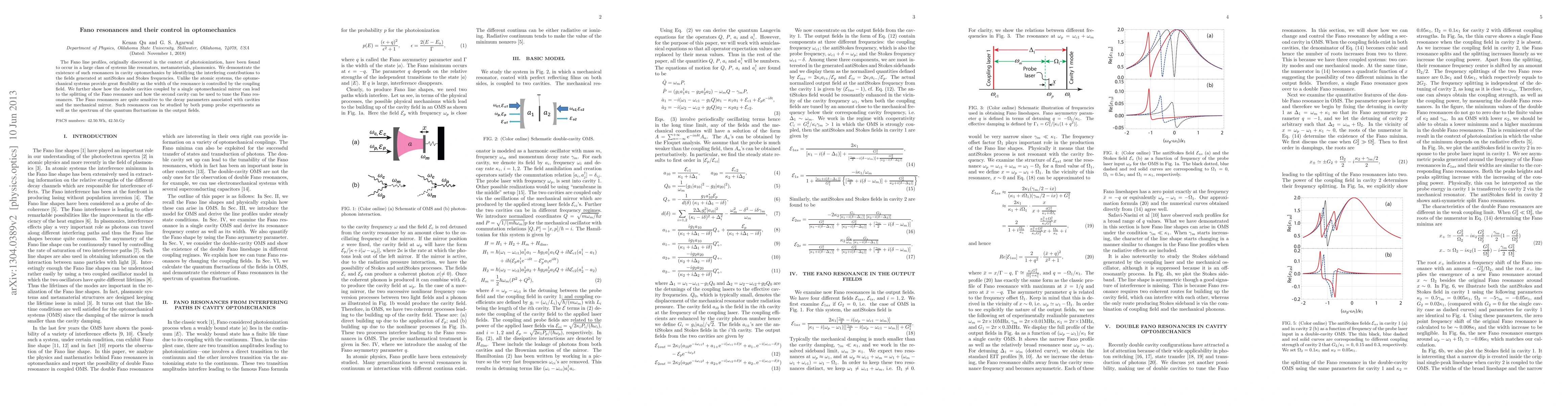 This paper explores Fano resonances in optomechanical systems, demonstrating their occurrence and control through coupling fields. It highlights the potential for tuning these resonances using double-cavity configurations and discusses their sensitivity to decay parameters, suggesting experimental study methods.