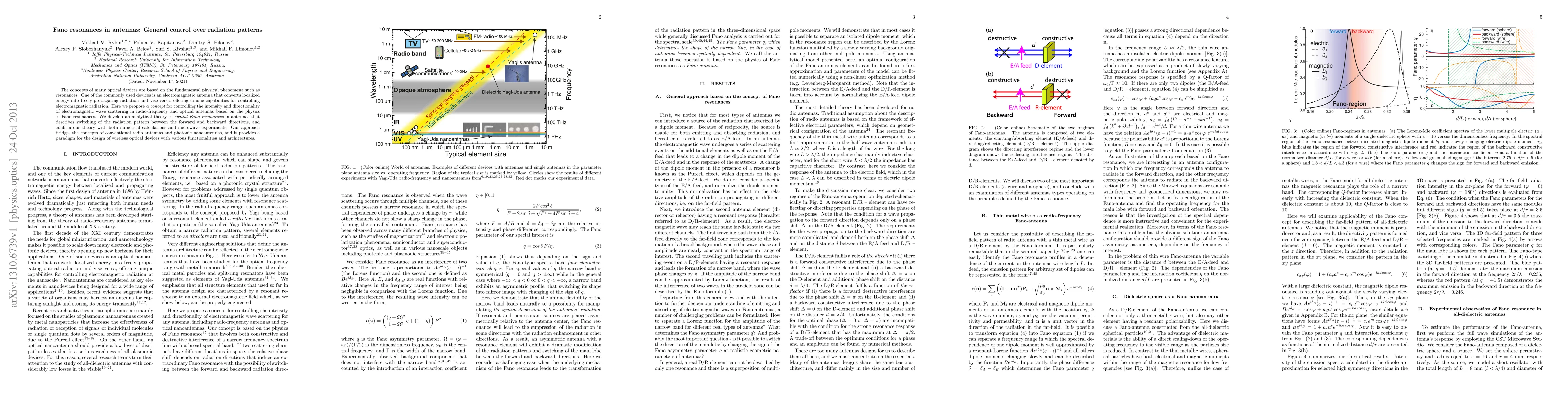 This paper proposes a method to control the radiation patterns of electromagnetic antennas using Fano resonances, developing an analytical theory that switches scattering between forward and backward directions. The approach is validated by numerical simulations and microwave experiments, bridging radio and photonic nanoantennas for advanced wireless optical device design.