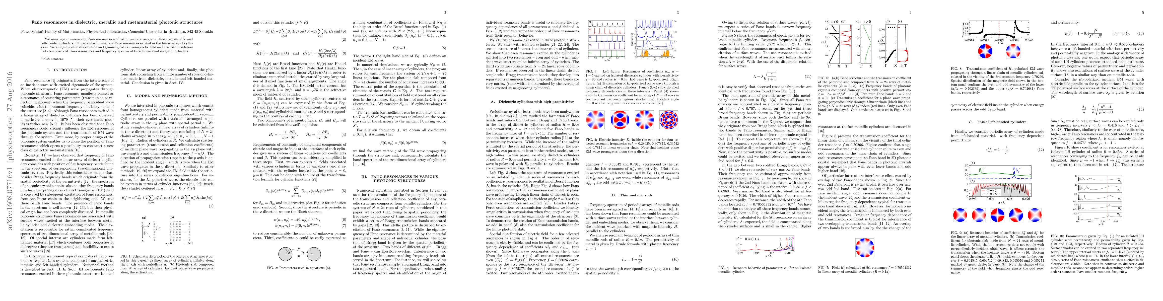 We investigate numerically Fano resonances excited in periodic arrays of dielectric, metallic and left-handed cylinders. Of particular interest are Fano resonances excited in the linear array of cylin- ders. We analyze spatial distribution and symmetry of electromagnetic field and discuss the relation between observed Fano resonances and frequency spectra of two-dimensional arrays of cylinders.