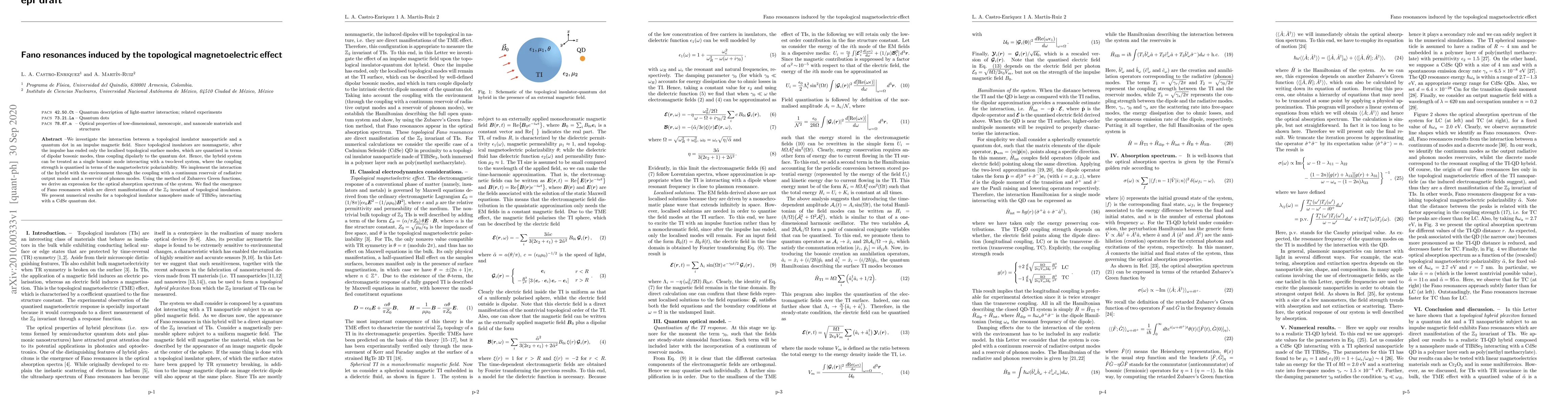 We investigate the interaction between a topological insulator nanoparticle and a quantum dot in an impulse magnetic field. Since topological insulators are nonmagnetic, after the impulse has ended only the localised topological surface modes, which are quantised in terms of dipolar bosonic modes, thus coupling dipolarly to the quantum dot. Hence, the hybrid system can be treated as a single bosonic mode interacting with a two-level system, where the coupling strength is quantised in terms of the magnetoelectric polarizability. We implement the interaction of the hybrid with the environment through the coupling with a continuum reservoir of radiative output modes and a reservoir of phonon modes. Using the method of Zubarev's Green functions, we derive an expression for the optical absorption spectrum of the system. We find the emergence of Fano resonances which are direct manifestations of the $\mathbb{Z}_{2}$ invariant of topological insulators. We present numerical results for a topological insulator nanosphere made of TlBiSe$_2$ interacting with a CdSe quantum dot.