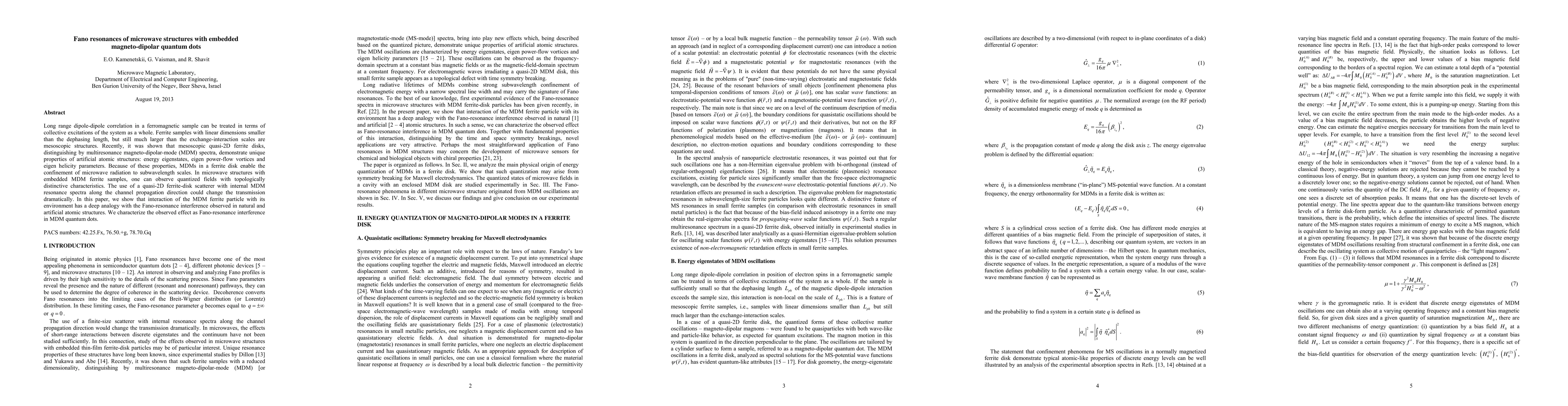 Long range dipole-dipole correlation in a ferromagnetic sample can be treated in terms of collective excitations of the system as a whole. Ferrite samples with linear dimensions smaller than the dephasing length, but still much larger than the exchange-interaction scales are mesoscopic structures. Recently, it was shown that mesoscopic quasi-2D ferrite disks, distinguishing by multiresonance magneto-dipolar-mode (MDM) spectra, demonstrate unique properties of artificial atomic structures: energy eigenstates, eigen power-flow vortices and eigen helicity parameters. Because of these properties, MDMs in a ferrite disk enable the confinement of microwave radiation to subwavelength scales. In microwave structures with embedded MDM ferrite samples, one can observe quantized fields with topologically distinctive characteristics. The use of a quasi-2D ferrite-disk scatterer with internal MDM resonance spectra along the channel propagation direction could change the transmission dramatically. In this paper, we show that interaction of the MDM ferrite particle with its environment has a deep analogy with the Fano-resonance interference observed in natural and artificial atomic structures. We characterize the observed effect as Fano-resonance interference in MDM quantum dots.