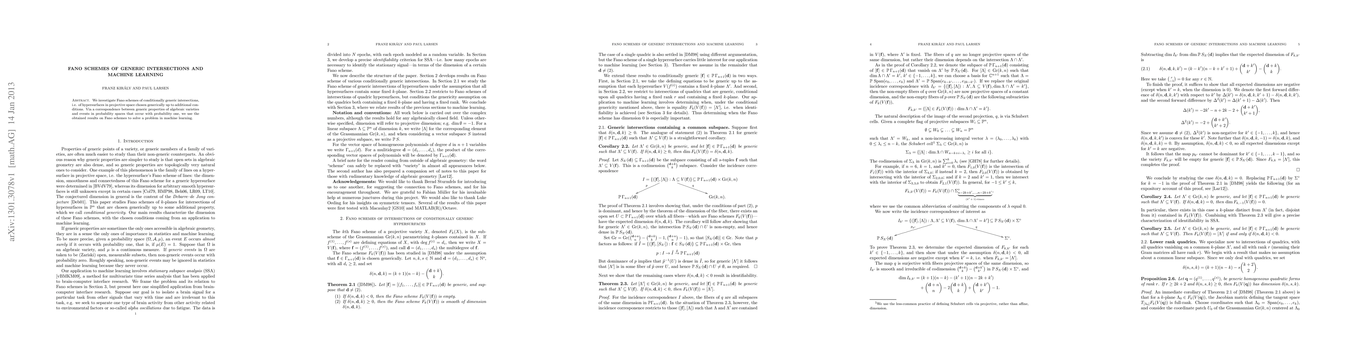 This paper explores Fano schemes of conditionally generic intersections of hypersurfaces in projective space and establishes a connection between algebraic properties and probability events. It leverages these insights to address a specific problem in machine learning.