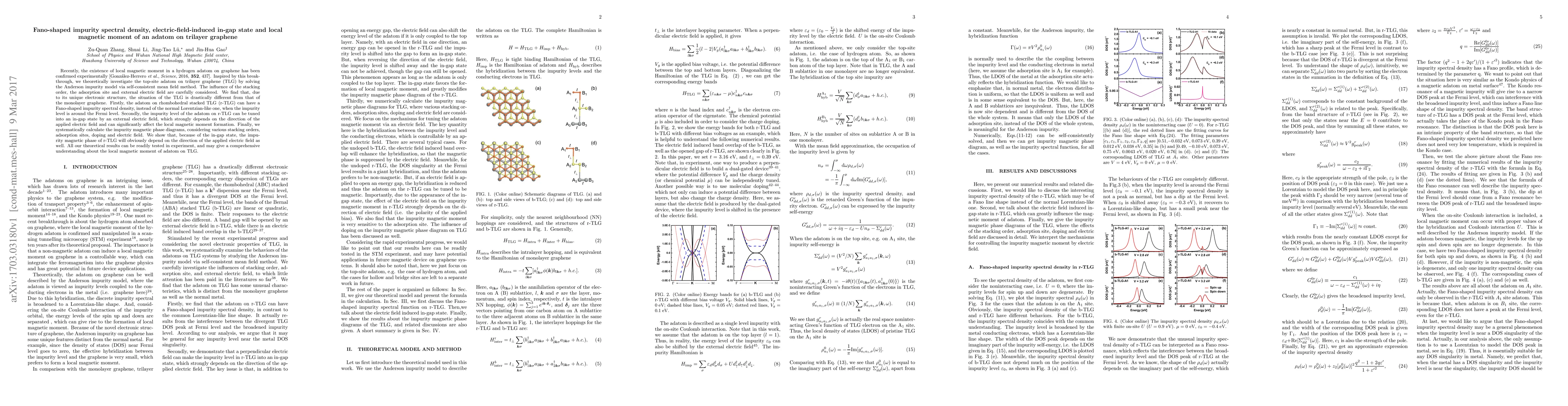 This paper investigates the electronic properties of a hydrogen adatom on trilayer graphene (TLG) using the Anderson impurity model, revealing that the adatom can create a Fano-shaped impurity spectral density and an in-gap state influenced by an external electric field, which significantly affects the local magnetic moment. Theoretical results suggest a strong dependence of the impurity magnetic phase on the applied electric field direction.