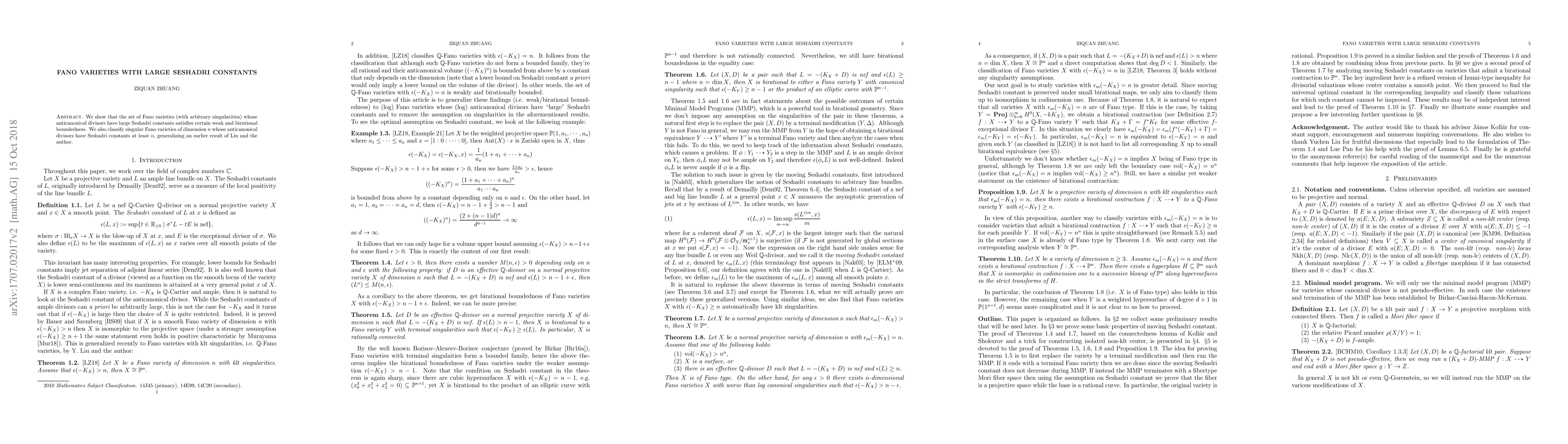 This paper demonstrates weak and birational boundedness for Fano varieties with large Seshadri constants and classifies singular Fano varieties of dimension $n$ with anticanonical divisors having Seshadri constants at least $n$.