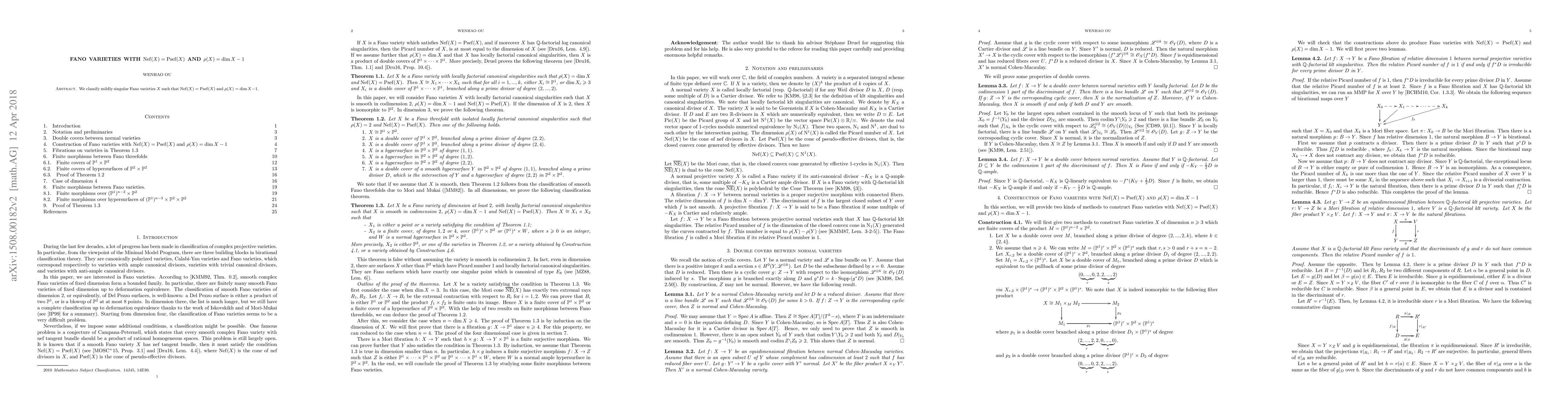 This paper classifies Fano varieties with specific properties, including equality between Nef and Psef sets and a Picard number equal to the dimension minus 1, which has implications for their geometry and algebraic structure.