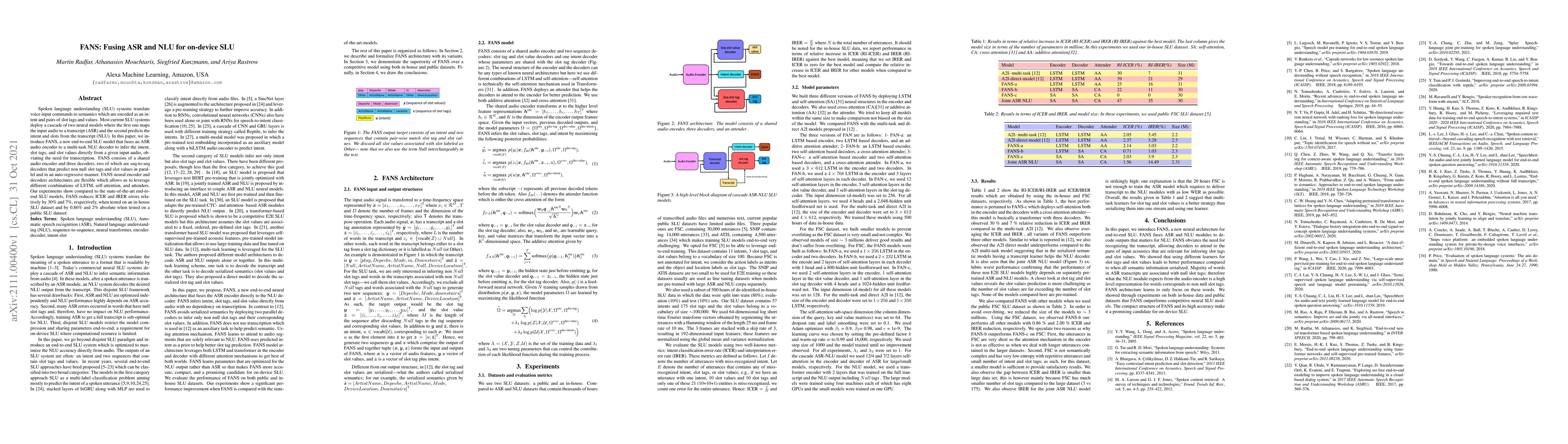Spoken language understanding (SLU) systems translate voice input commands to semantics which are encoded as an intent and pairs of slot tags and values. Most current SLU systems deploy a cascade of two neural models where the first one maps the input audio to a transcript (ASR) and the second predicts the intent and slots from the transcript (NLU). In this paper, we introduce FANS, a new end-to-end SLU model that fuses an ASR audio encoder to a multi-task NLU decoder to infer the intent, slot tags, and slot values directly from a given input audio, obviating the need for transcription. FANS consists of a shared audio encoder and three decoders, two of which are seq-to-seq decoders that predict non null slot tags and slot values in parallel and in an auto-regressive manner. FANS neural encoder and decoders architectures are flexible which allows us to leverage different combinations of LSTM, self-attention, and attenders. Our experiments show compared to the state-of-the-art end-to-end SLU models, FANS reduces ICER and IRER errors relatively by 30 % and 7 %, respectively, when tested on an in-house SLU dataset and by 0.86 % and 2 % absolute when tested on a public SLU dataset.