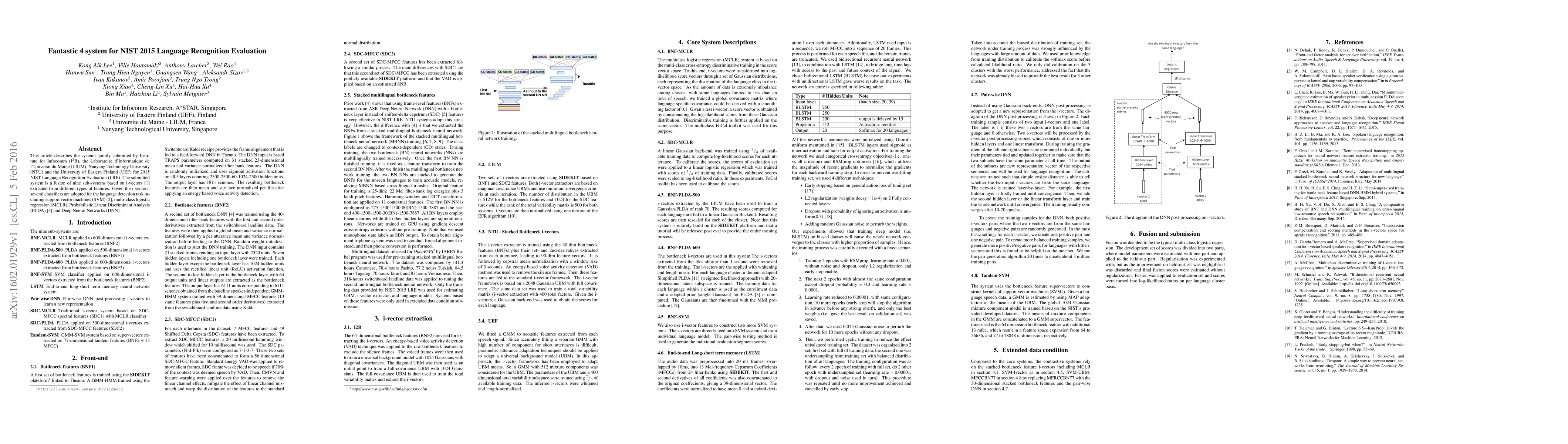 Researchers developed a system combining i-vectors from different features to improve language recognition accuracy in the NIST 2015 Language Recognition Evaluation. The system achieved strong results using various machine learning algorithms, including SVM, MCLR, PLDA, and DNN.