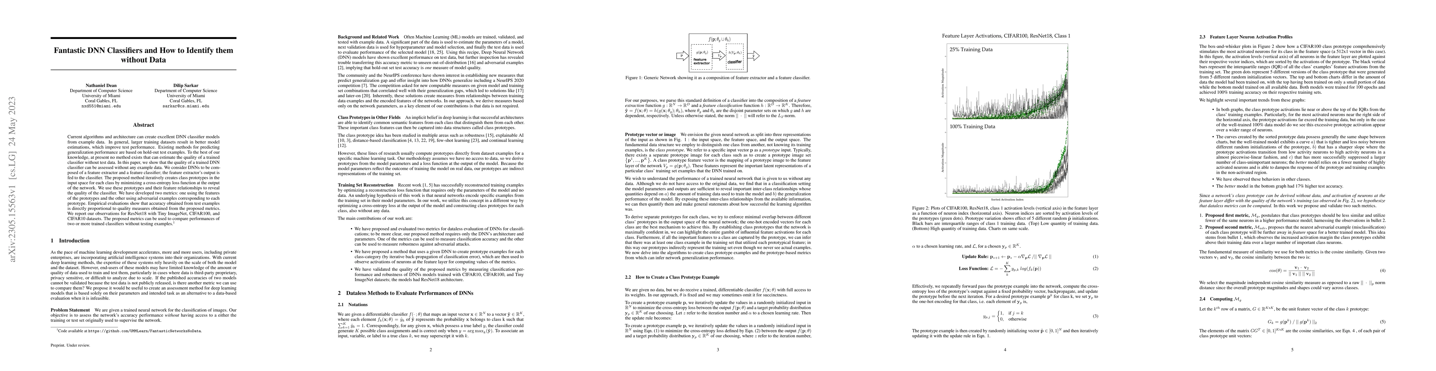 Current algorithms and architecture can create excellent DNN classifier models from example data. In general, larger training datasets result in better model estimations, which improve test performance. Existing methods for predicting generalization performance are based on hold-out test examples. To the best of our knowledge, at present no method exists that can estimate the quality of a trained DNN classifier without test data. In this paper, we show that the quality of a trained DNN classifier can be assessed without any example data. We consider DNNs to be composed of a feature extractor and a feature classifier; the feature extractor's output is fed to the classifier. The proposed method iteratively creates class prototypes in the input space for each class by minimizing a cross-entropy loss function at the output of the network. We use these prototypes and their feature relationships to reveal the quality of the classifier. We have developed two metrics: one using the features of the prototypes and the other using adversarial examples corresponding to each prototype. Empirical evaluations show that accuracy obtained from test examples is directly proportional to quality measures obtained from the proposed metrics. We report our observations for ResNet18 with Tiny ImageNet, CIFAR100, and CIFAR10 datasets. The proposed metrics can be used to compare performances of two or more classifiers without test examples.