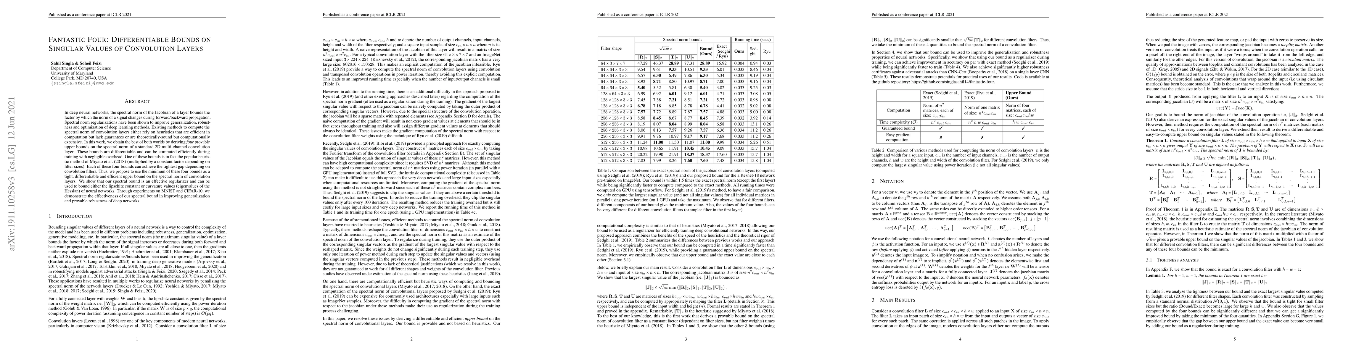 In deep neural networks, the spectral norm of the Jacobian of a layer bounds the factor by which the norm of a signal changes during forward/backward propagation. Spectral norm regularizations have been shown to improve generalization, robustness and optimization of deep learning methods. Existing methods to compute the spectral norm of convolution layers either rely on heuristics that are efficient in computation but lack guarantees or are theoretically-sound but computationally expensive. In this work, we obtain the best of both worlds by deriving {\it four} provable upper bounds on the spectral norm of a standard 2D multi-channel convolution layer. These bounds are differentiable and can be computed efficiently during training with negligible overhead. One of these bounds is in fact the popular heuristic method of Miyato et al. (multiplied by a constant factor depending on filter sizes). Each of these four bounds can achieve the tightest gap depending on convolution filters. Thus, we propose to use the minimum of these four bounds as a tight, differentiable and efficient upper bound on the spectral norm of convolution layers. We show that our spectral bound is an effective regularizer and can be used to bound either the lipschitz constant or curvature values (eigenvalues of the Hessian) of neural networks. Through experiments on MNIST and CIFAR-10, we demonstrate the effectiveness of our spectral bound in improving generalization and provable robustness of deep networks.