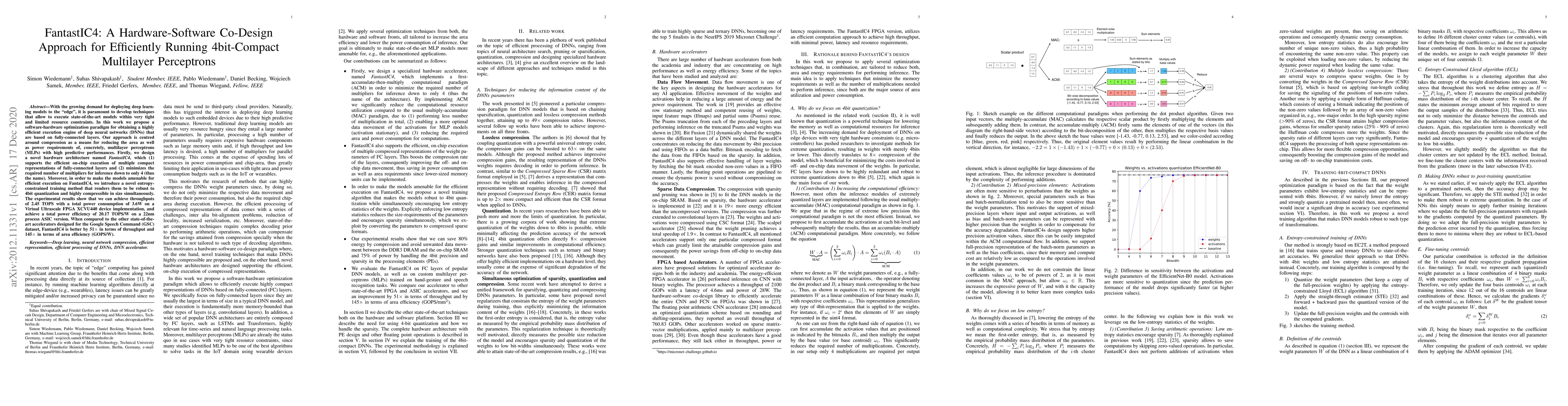 With the growing demand for deploying deep learning models to the "edge", it is paramount to develop techniques that allow to execute state-of-the-art models within very tight and limited resource constraints. In this work we propose a software-hardware optimization paradigm for obtaining a highly efficient execution engine of deep neural networks (DNNs) that are based on fully-connected layers. Our approach is centred around compression as a means for reducing the area as well as power requirements of, concretely, multilayer perceptrons (MLPs) with high predictive performances. Firstly, we design a novel hardware architecture named FantastIC4, which (1) supports the efficient on-chip execution of multiple compact representations of fully-connected layers and (2) minimizes the required number of multipliers for inference down to only 4 (thus the name). Moreover, in order to make the models amenable for efficient execution on FantastIC4, we introduce a novel entropy-constrained training method that renders them to be robust to 4bit quantization and highly compressible in size simultaneously. The experimental results show that we can achieve throughputs of 2.45 TOPS with a total power consumption of 3.6W on a Virtual Ultrascale FPGA XCVU440 device implementation, and achieve a total power efficiency of 20.17 TOPS/W on a 22nm process ASIC version. When compared to the other state-of-the-art accelerators designed for the Google Speech Command (GSC) dataset, FantastIC4 is better by 51$\times$ in terms of throughput and 145$\times$ in terms of area efficiency (GOPS/W).