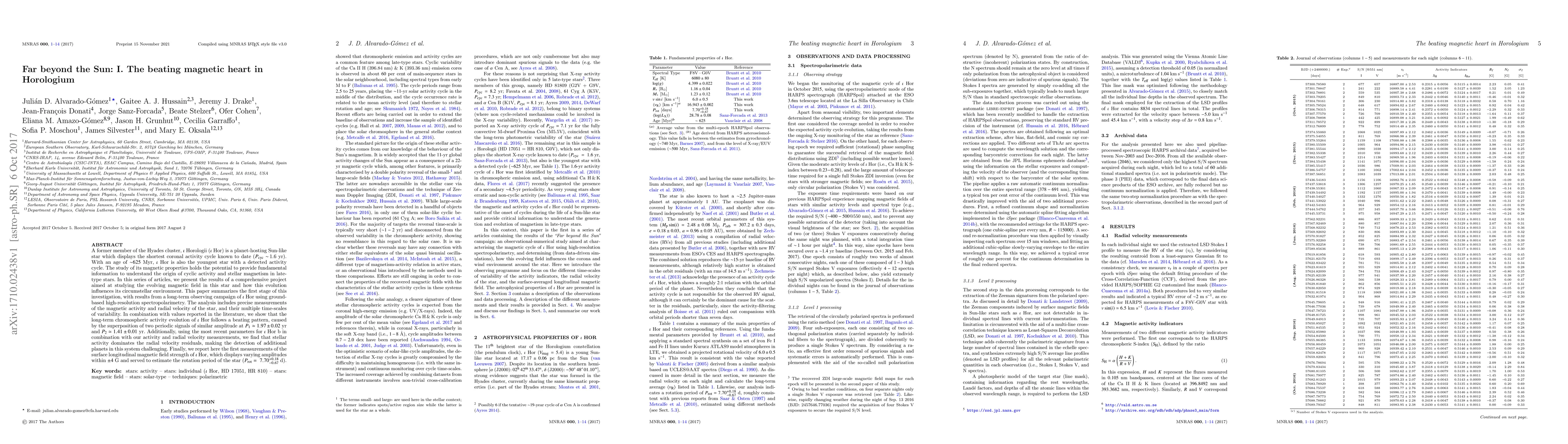 A former member of the Hyades cluster, $\iota$ Horologii ($\iota$ Hor) is a planet-hosting Sun-like star which displays the shortest coronal activity cycle known to date ($P_{\rm cyc}\sim$ 1.6 yr). With an age of $\sim$$625$ Myr, $\iota$ Hor is also the youngest star with a detected activity cycle. The study of its magnetic properties holds the potential to provide fundamental information to understand the origin of cyclic activity and stellar magnetism in late-type stars. In this series of articles, we present the results of a comprehensive project aimed at studying the evolving magnetic field in this star and how this evolution influences its circumstellar environment. This paper summarizes the first stage of this investigation, with results from a long-term observing campaign of $\iota$ Hor using ground-based high-resolution spectropolarimetry. The analysis includes precise measurements of the magnetic activity and radial velocity of the star, and their multiple time-scales of variability. In combination with values reported in the literature, we show that the long-term chromospheric activity evolution of $\iota$ Hor follows a beating pattern, caused by the superposition of two periodic signals of similar amplitude at $P_{1} \simeq 1.97 \pm 0.02$ yr and $P_{2} \simeq 1.41 \pm 0.01$ yr. Additionally, using the most recent parameters for $\iota$ Hor b in combination with our activity and radial velocity measurements, we find that stellar activity dominates the radial velocity residuals, making the detection of additional planets in this system challenging. Finally, we report here the first measurements of the surface longitudinal magnetic field strength of $\iota$ Hor, which displays varying amplitudes within $\pm4$ G and served to estimate the rotation period of the star ($P_{\rm rot} =~7.70^{+0.18}_{-0.67}$ d).
