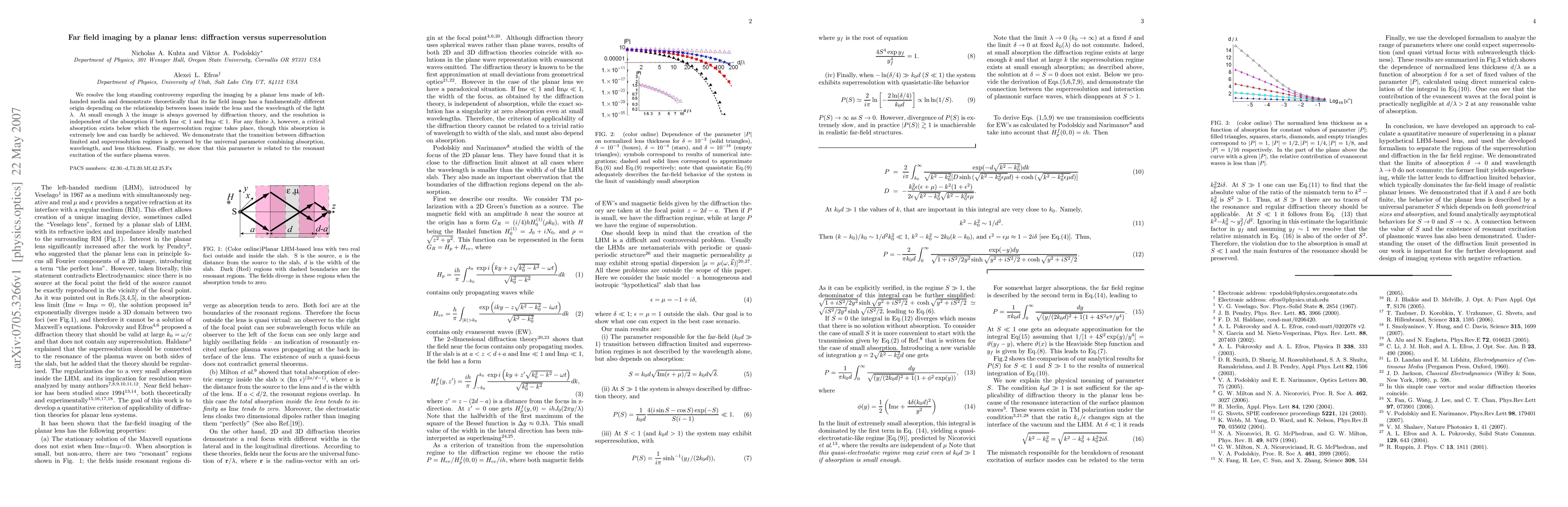 The paper resolves a controversy on far-field imaging by a planar lens in left-handed media, showing that its image is governed by diffraction or superresolution depending on absorption and wavelength.
