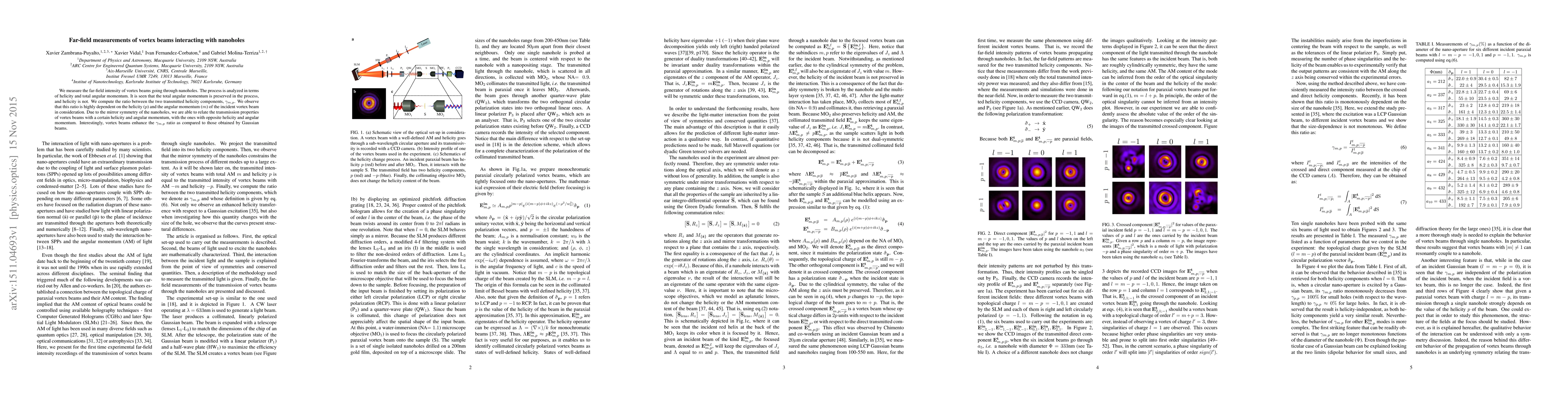 Researchers measured vortex beam intensity through nanoholes, finding that total angular momentum is preserved but helicity is not, with transmission ratios varying depending on beam properties.