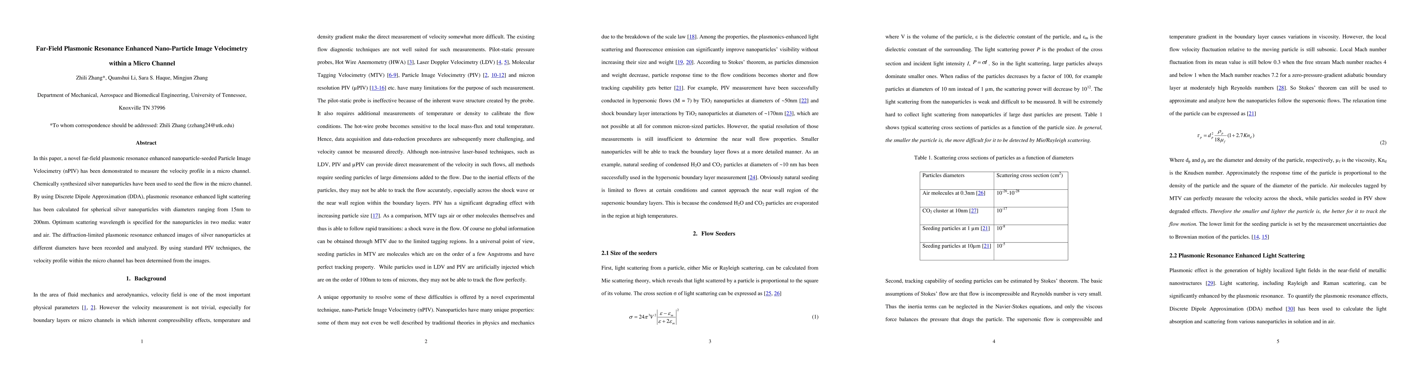 This paper introduces a new method for measuring velocity profiles in micro channels using far-field plasmonic resonance enhanced nanoparticle-seeded Particle Image Velocimetry (nPIV). Chemically synthesized silver nanoparticles are used to seed the flow, and Discrete Dipole Approximation (DDA) is applied to determine the optimal scattering wavelengths for different nanoparticle sizes, enabling accurate velocity profile determination.