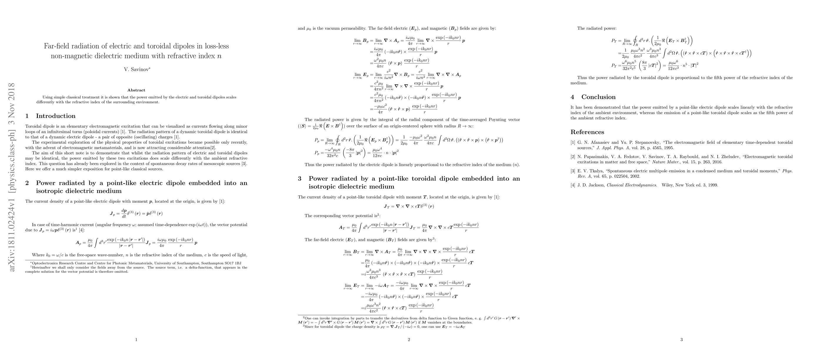 Summary: The study demonstrates that the power emitted by electric and toroidal dipoles in a loss-less non-magnetic dielectric medium varies with the medium's refractive index, highlighting distinct scaling behaviors for each type of dipole.