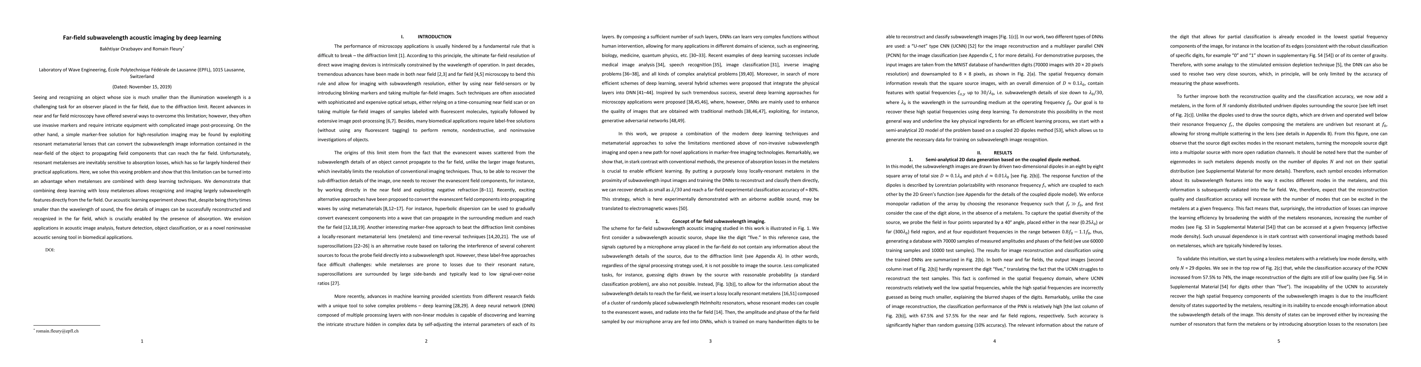 This research demonstrates a deep learning approach that enables far-field subwavelength acoustic imaging using lossy metalenses. It successfully reconstructs and recognizes features thirty times smaller than the sound wavelength, leveraging absorption losses to enhance imaging capability, with potential applications in acoustic imaging and biomedical sensing.
