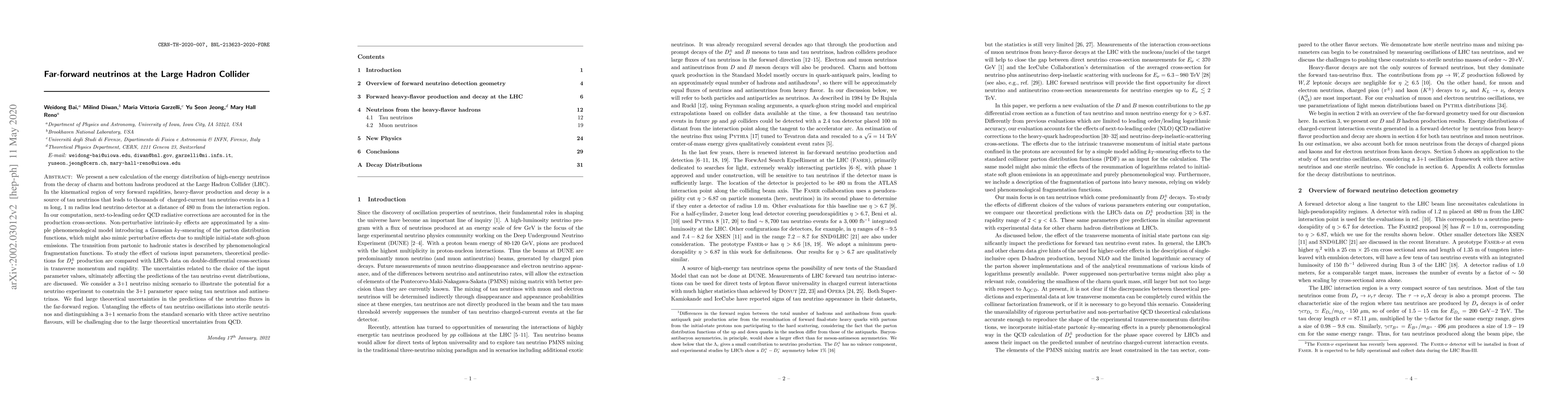 We present a new calculation of the energy distribution of high-energy neutrinos from the decay of charm and bottom hadrons produced at the Large Hadron Collider (LHC). In the kinematical region of very forward rapidities, heavy-flavor production and decay is a source of tau neutrinos that leads to thousands of { charged-current} tau neutrino events in a 1 m long, 1 m radius lead neutrino detector at a distance of 480 m from the interaction region. In our computation, next-to-leading order QCD radiative corrections are accounted for in the production cross-sections. Non-perturbative intrinsic-$k_T$ effects are approximated by a simple phenomenological model introducing a Gaussian $k_T$-smearing of the parton distribution functions, which might also mimic perturbative effects due to multiple initial-state soft-gluon emissions. The transition from partonic to hadronic states is described by phenomenological fragmentation functions. To study the effect of various input parameters, theoretical predictions for $D_s^\pm$ production are compared with LHCb data on double-differential cross-sections in transverse momentum and rapidity. The uncertainties related to the choice of the input parameter values, ultimately affecting the predictions of the tau neutrino event distributions, are discussed. We consider a 3+1 neutrino mixing scenario to illustrate the potential for a neutrino experiment to constrain the 3+1 parameter space using tau neutrinos and antineutrinos. We find large theoretical uncertainties in the predictions of the neutrino fluxes in the far-forward region. Untangling the effects of tau neutrino oscillations into sterile neutrinos and distinguishing a 3+1 scenario from the standard scenario with three active neutrino flavours, will be challenging due to the large theoretical uncertainties from QCD.