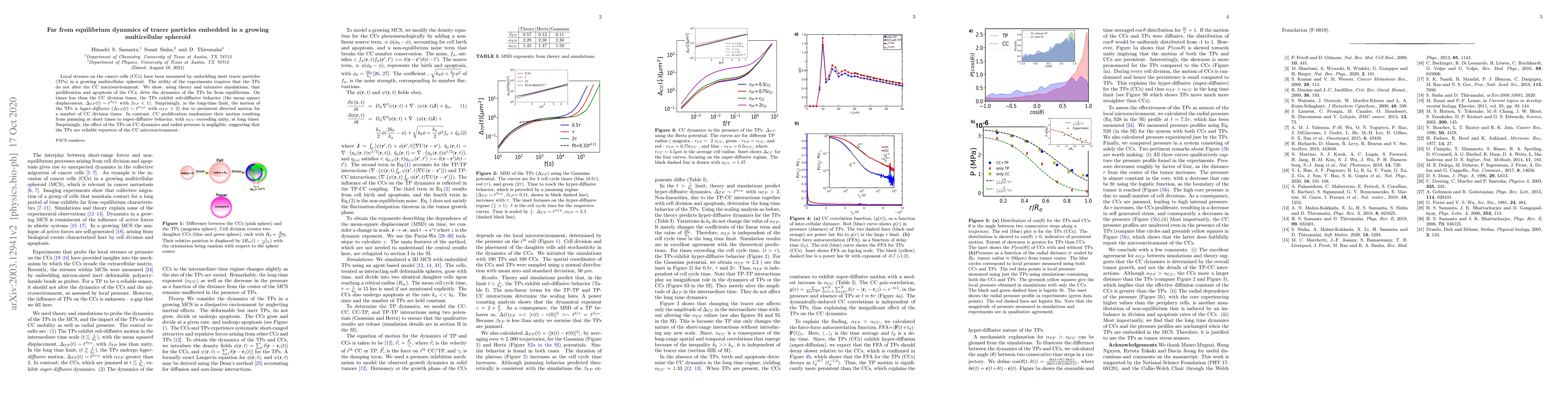 By embedding inert tracer particles (TPs) in a growing multicellular spheroid the local stresses on the cancer cells (CCs) can be measured. In order for this technique to be effective the unknown effect of the dynamics of the TPs on the CCs has to be elucidated to ensure that the TPs do not greatly alter the local stresses on the CCs. We show, using theory and simulations, that the self-generated (active) forces arising from proliferation and apoptosis of the CCs drive the dynamics of the TPs far from equilibrium. On time scales less than the division times of the CCs, the TPs exhibit sub-diffusive dynamics (the mean square displacement, $\Delta_{TP}(t) \sim t^{\beta_{TP}}$ with $\beta_{TP}<1$), similar to glass-forming systems. Surprisingly, in the long-time limit, the motion of the TPs is hyper-diffusive ($\Delta_{TP}(t) \sim t^{\alpha_{TP}}$ with $\alpha_{TP}>2$) due to persistent directed motion for long times. In comparison, proliferation of the CCs randomizes their motion leading to superdiffusive behavior with $\alpha_{CC}$ exceeding unity. Most importantly, $\alpha_{CC}$ is not significantly affected by the TPs. Our predictions could be tested using \textit{in vitro} imaging methods where the motion of the TPs and the CCs can be tracked.