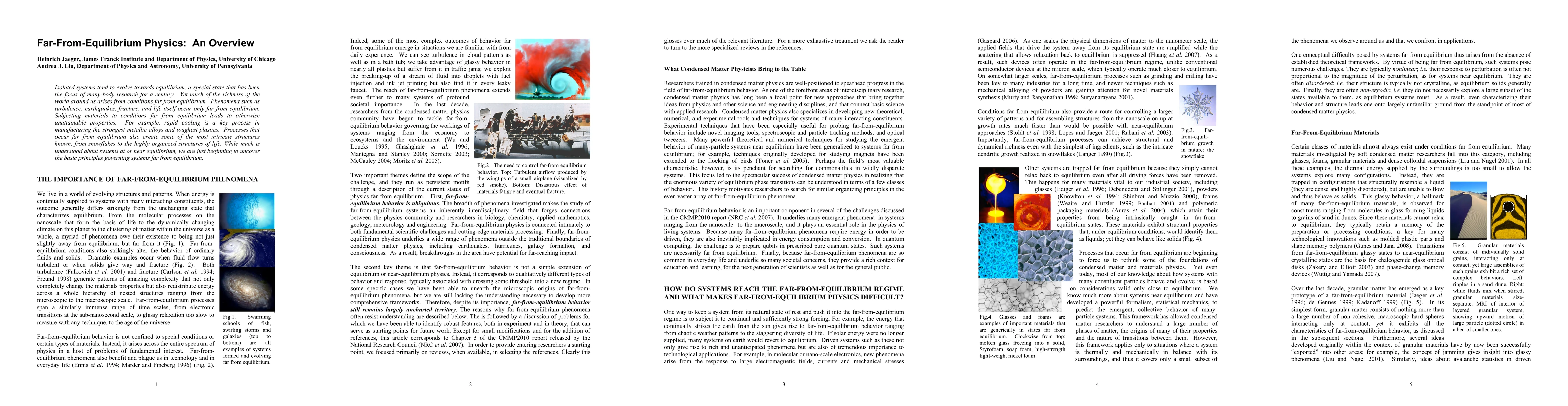 Isolated systems tend to evolve towards equilibrium, a special state that has been the focus of many-body research for a century. Yet much of the richness of the world around us arises from conditions far from equilibrium. Phenomena such as turbulence, earthquakes, fracture, and life itself occur only far from equilibrium. Subjecting materials to conditions far from equilibrium leads to otherwise unattainable properties. For example, rapid cooling is a key process in manufacturing the strongest metallic alloys and toughest plastics. Processes that occur far from equilibrium also create some of the most intricate structures known, from snowflakes to the highly organized structures of life. While much is understood about systems at or near equilibrium, we are just beginning to uncover the basic principles governing systems far from equilibrium.