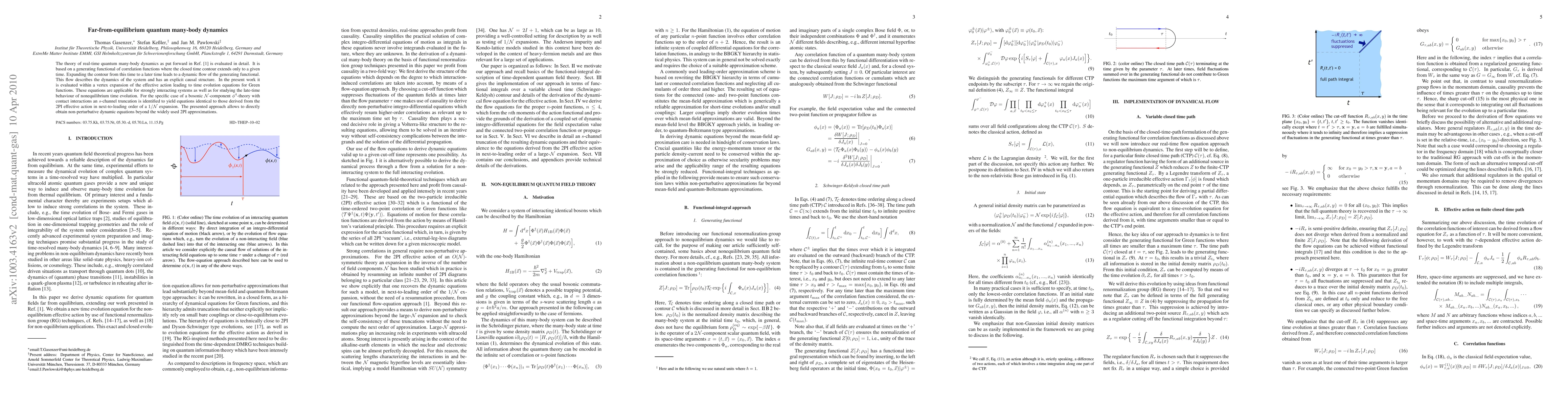 The theory of real-time quantum many-body dynamics as put forward in Ref. [arXiv:0710.4627] is evaluated in detail. The formulation is based on a generating functional of correlation functions where the Keldysh contour is closed at a given time. Extending the Keldysh contour from this time to a later time leads to a dynamic flow of the generating functional. This flow describes the dynamics of the system and has an explicit causal structure. In the present work it is evaluated within a vertex expansion of the effective action leading to time evolution equations for Green functions. These equations are applicable for strongly interacting systems as well as for studying the late-time behaviour of nonequilibrium time evolution. For the specific case of a bosonic N-component phi^4 theory with contact interactions an s-channel truncation is identified to yield equations identical to those derived from the 2PI effective action in next-to-leading order of a 1/N expansion. The presented approach allows to directly obtain non-perturbative dynamic equations beyond the widely used 2PI approximations.