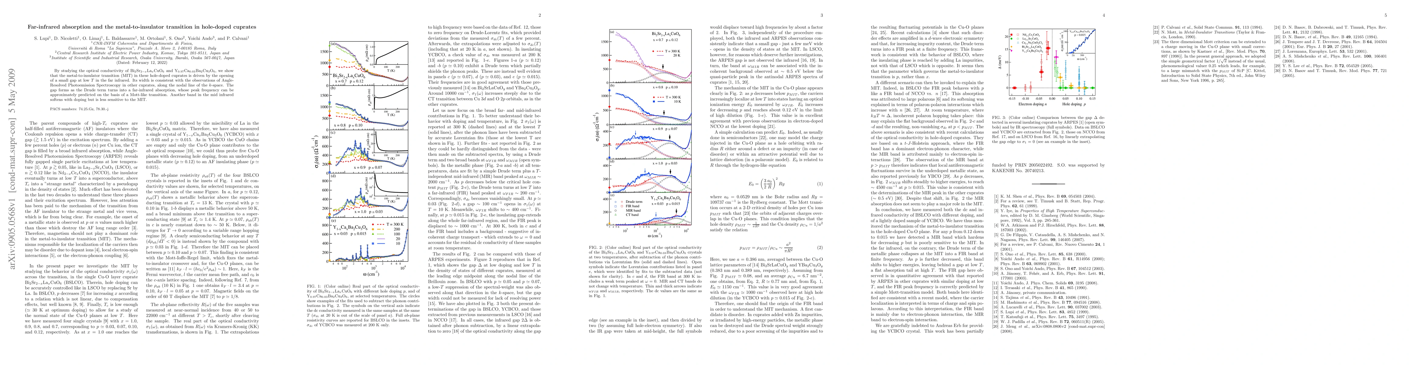 This paper demonstrates that the metal-to-insulator transition in hole-doped cuprates like BSLCO and YCBCO is driven by a small gap opening in the far-infrared region, consistent with ARPES observations. The transition is marked by the transformation from a Drude term to far-infrared absorption, with the peak frequency predicted by a Mott-like transition.