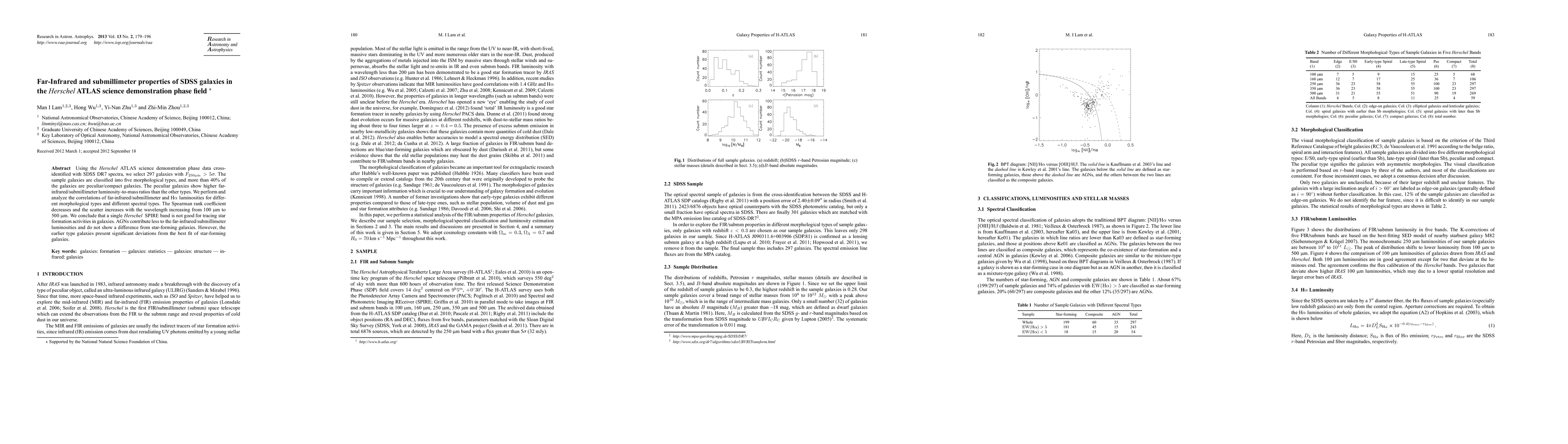 Using the Herschel ATLAS science demonstration phase data crossidentified with SDSS DR7 spectra, we select 297 galaxies with F250{\mu}m > 5{\sigma}. The sample galaxies are classified into five morphological types, and more than 40% of the galaxies are peculiar/compact galaxies. The peculiar galaxies show higher far-infrared/submillimeter luminosity-to-mass ratios than the other types. We perform and analyze the correlations of far-infrared/submillimeter and H{\alpha} luminosities for different morphological types and different spectral types. The Spearman rank coefficient decreases and the scatter increases with the wavelength increasing from 100 {\mu}m to 500 {\mu}m. We conclude that a single Herschel SPIRE band is not good for tracing star formation activities in galaxies. AGNs contribute less to the far-infrared/submillimeter luminosities and do not show a difference from star-forming galaxies. However, the earlier type galaxies present significant deviations from the best fit of star-forming galaxies.