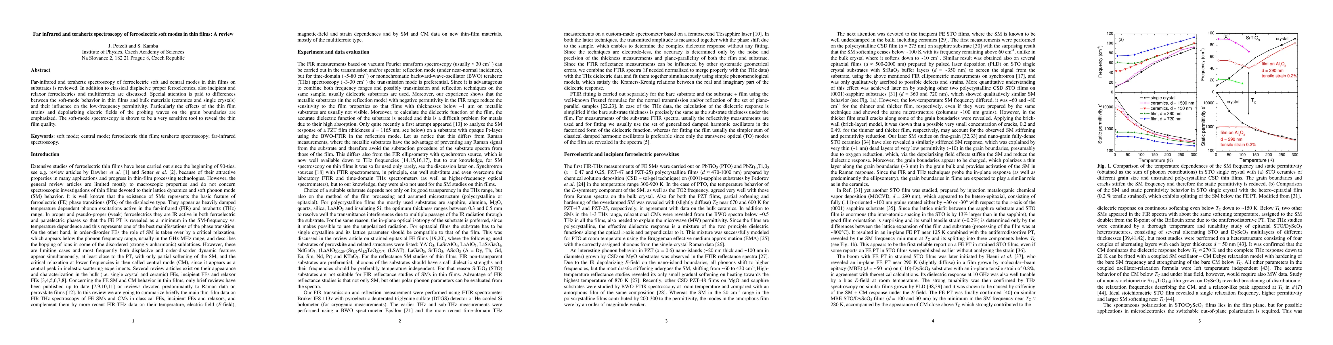 This review examines far-infrared and terahertz spectroscopy techniques for analyzing ferroelectric soft modes in thin films, comparing their behavior to bulk materials. It highlights the influence of thin film strains and electric fields on grain boundaries, emphasizing the technique's sensitivity in assessing thin film quality.