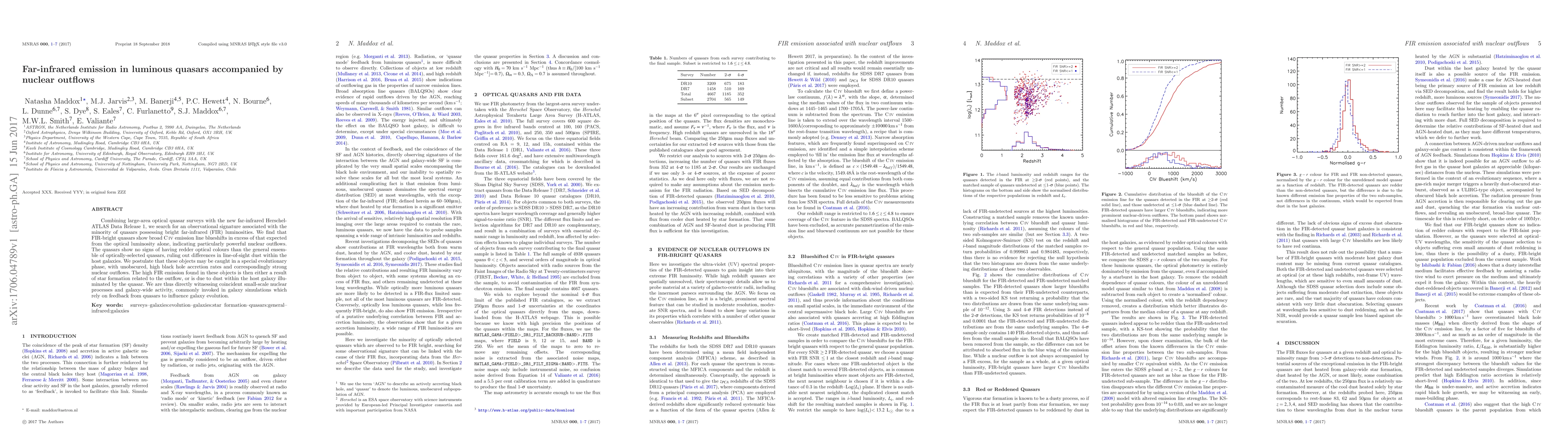 This study finds that a subset of luminous quasars with bright far-infrared emissions exhibit strong nuclear outflows, indicated by broad CIV emission line blueshifts. These outflows suggest high black hole accretion rates and may be linked to either star formation or dust heating within the host galaxy.