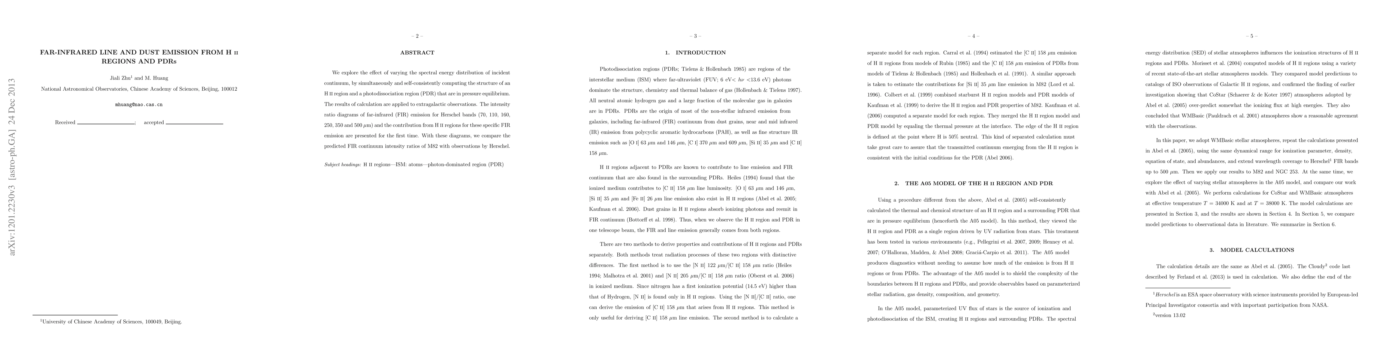 This paper investigates the far-infrared line and dust emission from H II and photodissociation regions under varying spectral energy distributions, presenting new intensity ratio diagrams for Herschel bands. The study compares predicted far-infrared continuum intensity ratios from M82 with Herschel observations.