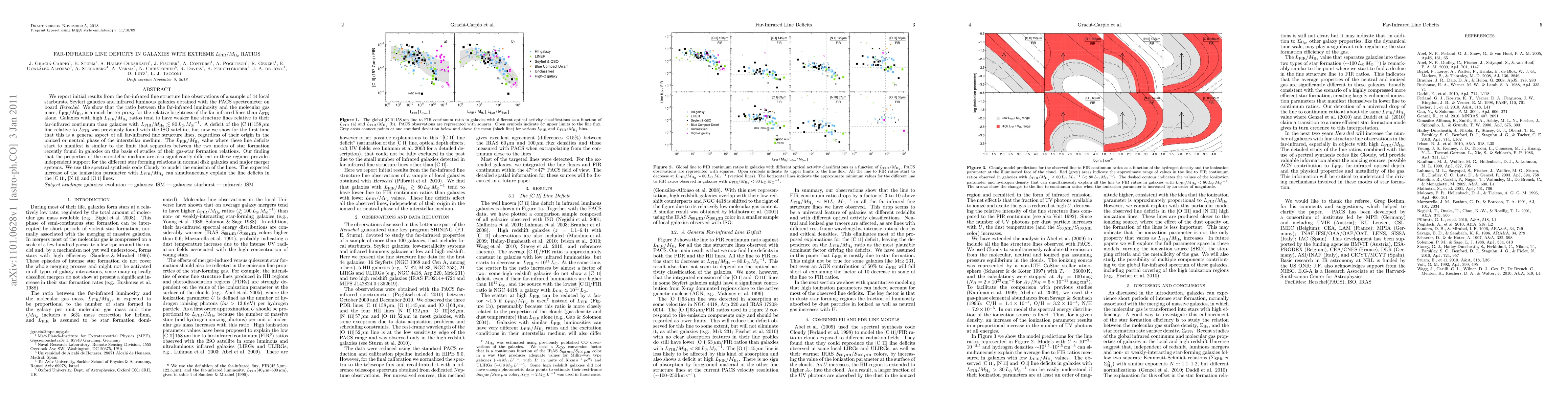This study reveals that galaxies with high far-infrared luminosity to molecular gas mass ratios (Lfir/MH2) exhibit weaker far-infrared fine structure lines compared to those with lower ratios. The findings suggest a general deficit in lines like [C II], [N II], and [O I], supporting different star formation regimes in normal disk galaxies versus major merger systems.