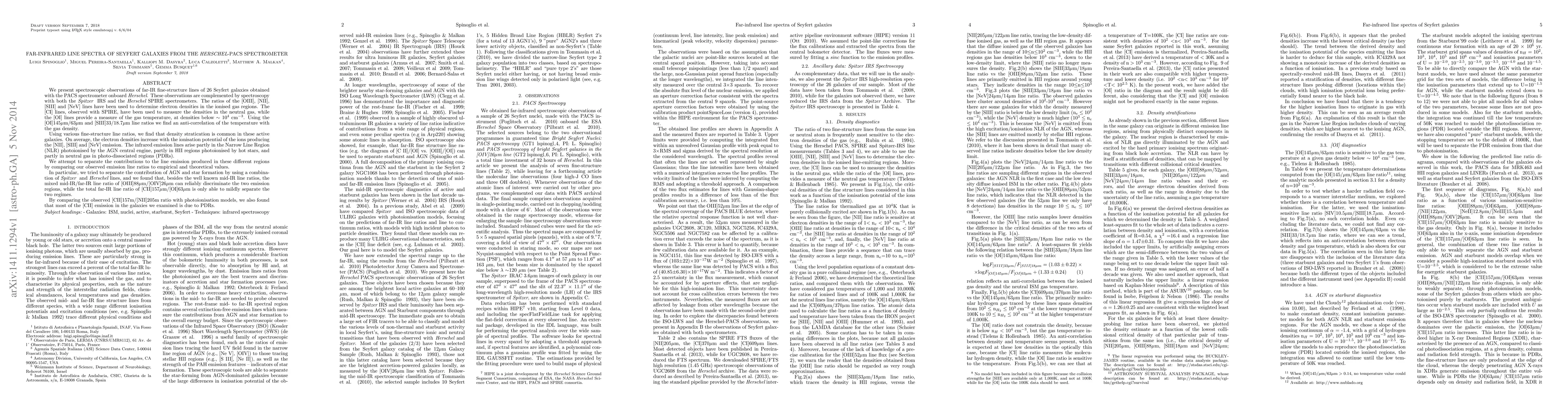 This study uses Herschel-PACS and Spitzer-IRS observations to analyze far-infrared line spectra in 26 Seyfert galaxies, revealing density stratification and anti-correlation between gas temperature and density in ionized regions. The research identifies contributions from AGN, star formation, and photo-dissociated regions, with the OIII88um/OIV26um ratio effectively distinguishing between AGN and star formation influences.